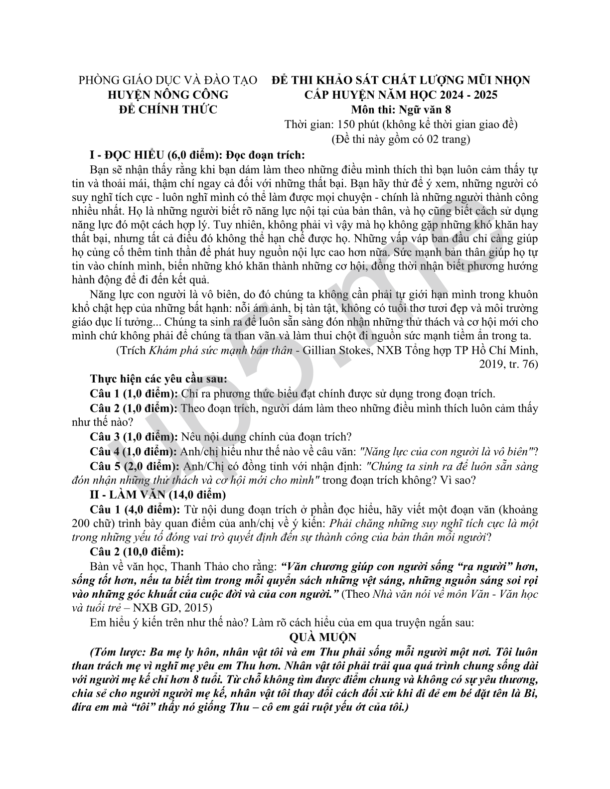 | PHÒNG GIÁO DỤC VÀ ĐÀO TẠOHUYỆN NÔNG CÔNGĐỂ CHÍNH THỨC | ĐỂ THI KHẢO SÁT CHẤT LƯỢNG MŨI NHỌN CẤP HUYỆN NĂM HỌC 2024 - 2025 Môn thi: Ngữ văn 8 Thời gian: 150 phút (không kể thời gian giao đề) (Đề thi này gồm có 02 trang) |