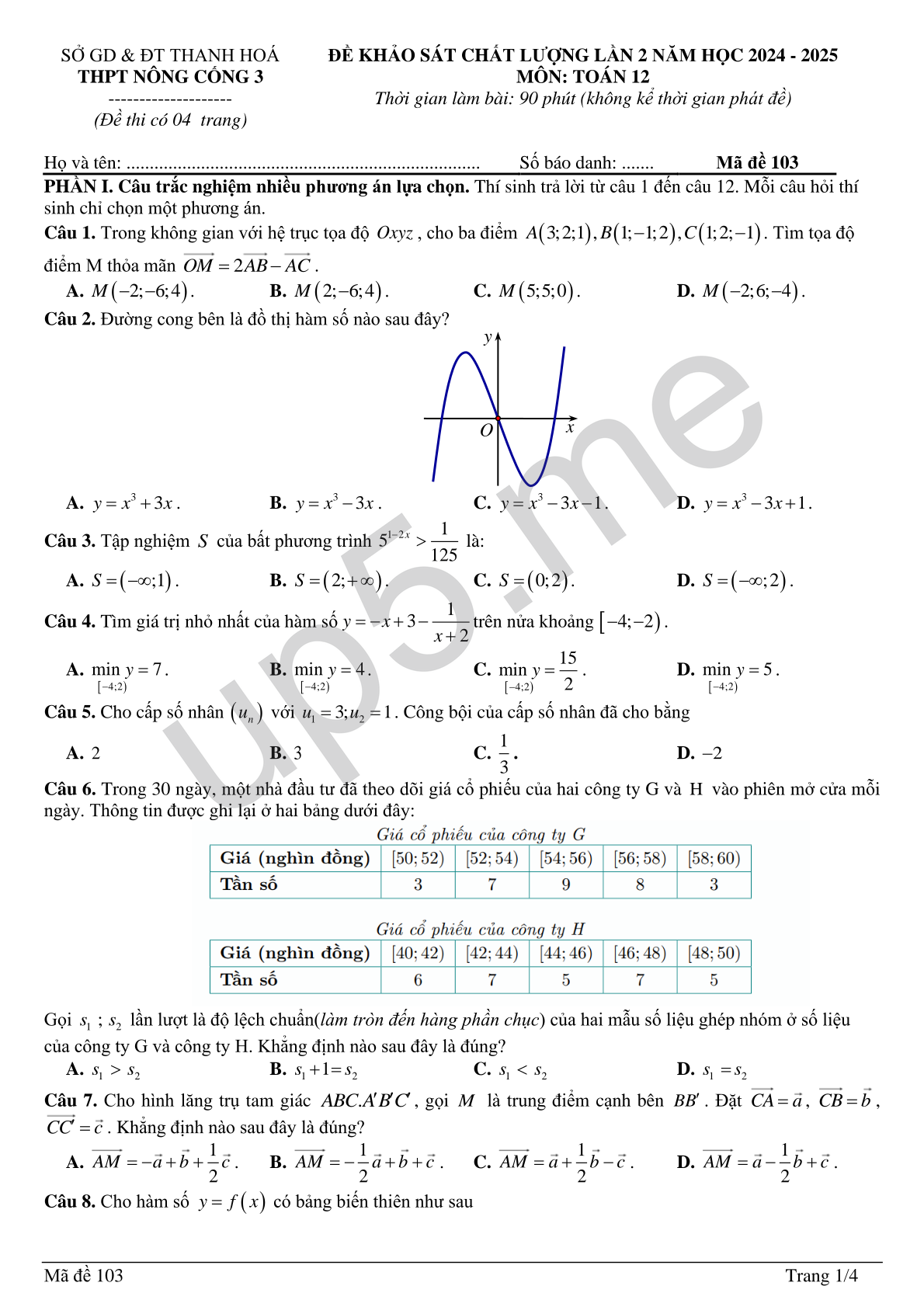 ĐỀ KHẢO SÁT CHẤT LƯỢNG LẦN 2 NĂM HỌC 2024 - 2025 MÔN: TOÁN 12 Thời gian làm bài: 90 phút (không kể thời gian phát đề) |