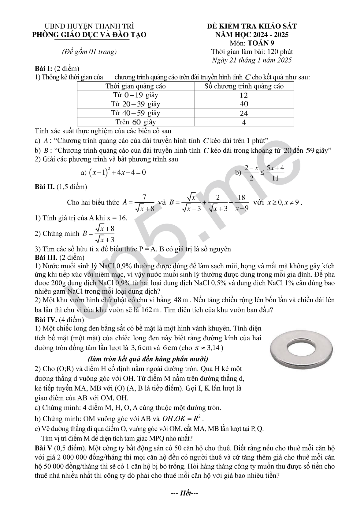 ĐỀ KIỂM TRA KHẢO SÁT NĂM HỌC 2024 - 2025 Môn: TOÁN 9 Thời gian làm bài: 120 phút Ngày 21 tháng 1 năm 2025 |