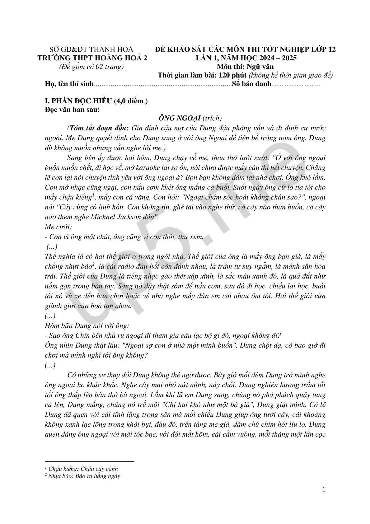 | SỞ GD&ĐT THANH HOÁ TRƯỜNG THPT HOẰNG HOÁ 2(Đề gồm có 02 trang) | ĐỀ KHẢO SÁT CÁC MÔN THI TỐT NGHIỆP LỚP 12 LẦN 1, NĂM HỌC 2024 – 2025Môn thi: Ngữ văn Thời gian làm bài: 120 phút (không kể thời gian giao đề) |