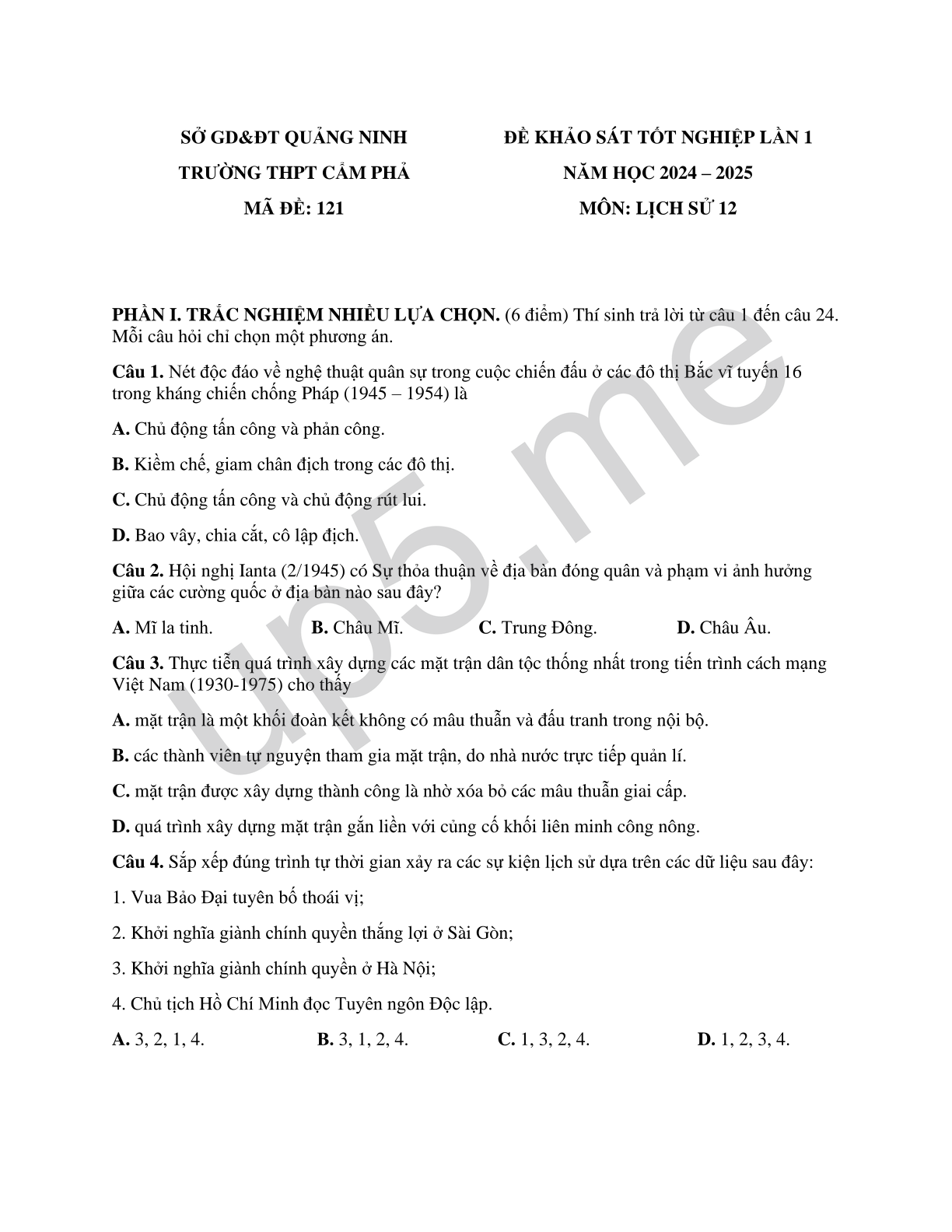 ĐỀ KHẢO SÁT TỐT NGHIỆP LẦN 1NĂM HỌC 2024 – 2025MÔN: LỊCH SỬ 12 |