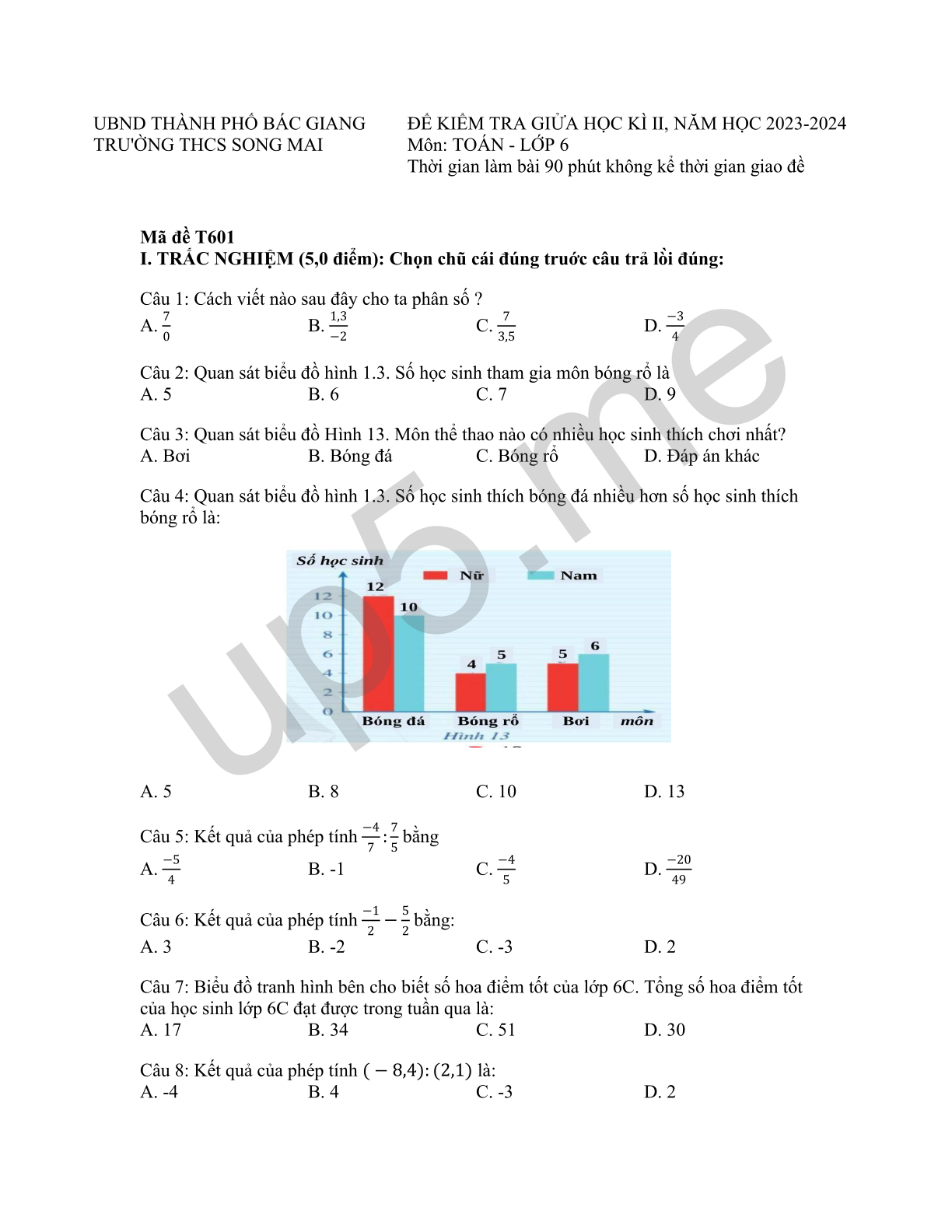 ĐỀ KIỂM TRA GIỮA HỌC KÌ II, NĂM HỌC 2023-2024 Môn: TOÁN - LỚP 6 Thời gian làm bài 90 phút không kể thời gian giao đề |