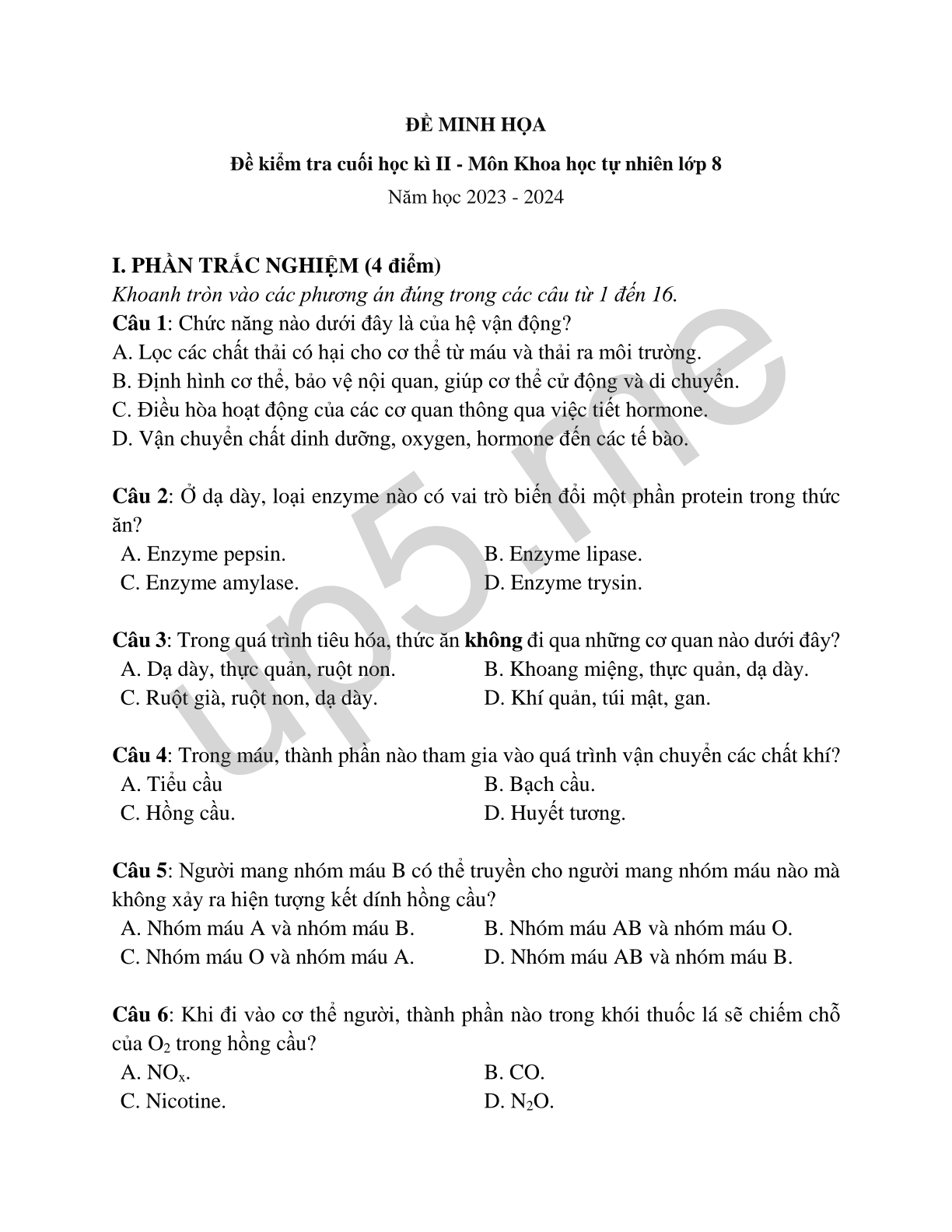 Đề kiểm tra cuối học kì II - Môn Khoa học tự nhiên lớp 8