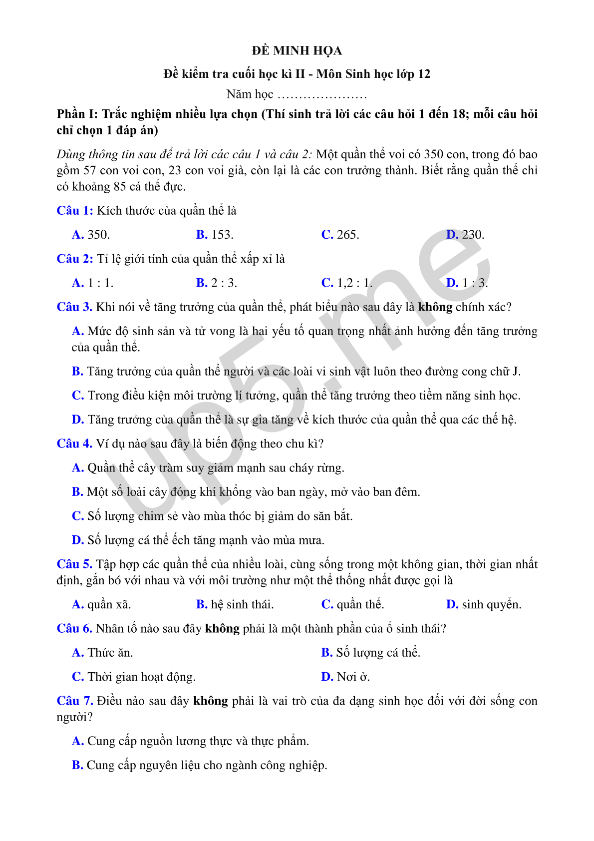 Phần I: Trắc nghiệm nhiều lựa chọn (Thí sinh trả lời các câu hỏi 1 đến 18; mỗi câu hỏi chỉ chọn 1 đáp án)