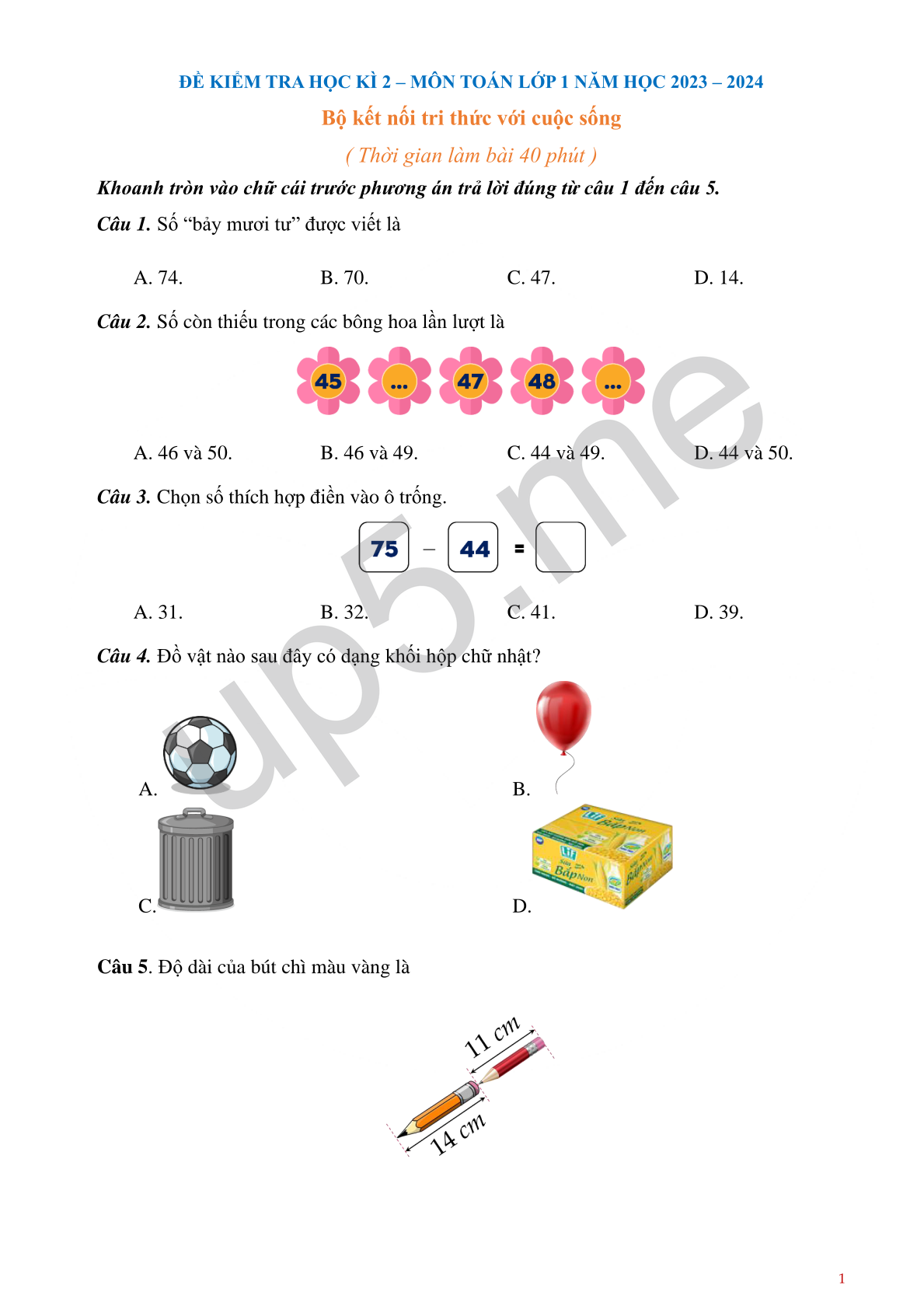 ĐỀ KIỂM TRA HỌC KÌ 2 – MÔN TOÁN LỚP 1 NĂM HỌC 2023 – 2024