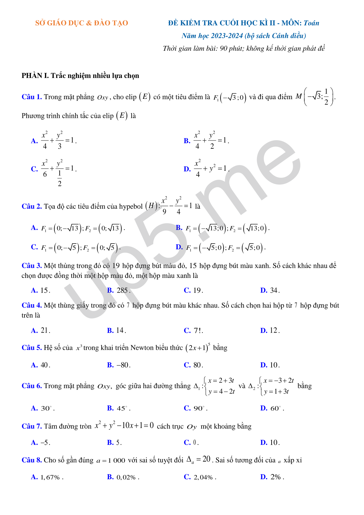 | SỞ GIÁO DỤC & ĐÀO TẠO | ĐỀ KIỂM TRA CUỐI HỌC KÌ II - MÔN: Toán Năm học 2023-2024 (bộ sách Cánh diều)Thời gian làm bài: 90 phút; không kể thời gian phát đề |