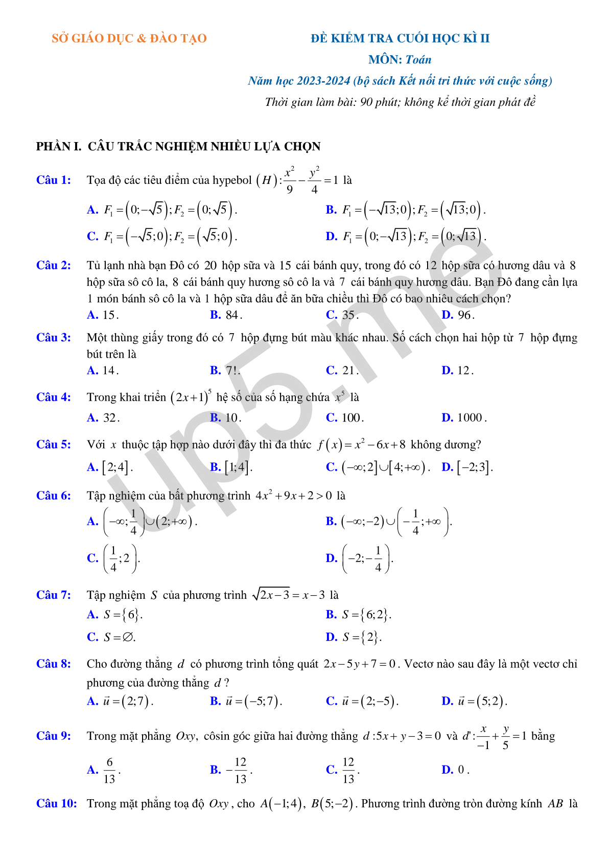 | SỞ GIÁO DỤC & ĐÀO TẠO | ĐỀ KIỂM TRA CUỐI HỌC KÌ IIMÔN: Toán Năm học 2023-2024 (bộ sách Kết nối tri thức với cuộc sống)Thời gian làm bài: 90 phút; không kể thời gian phát đề |