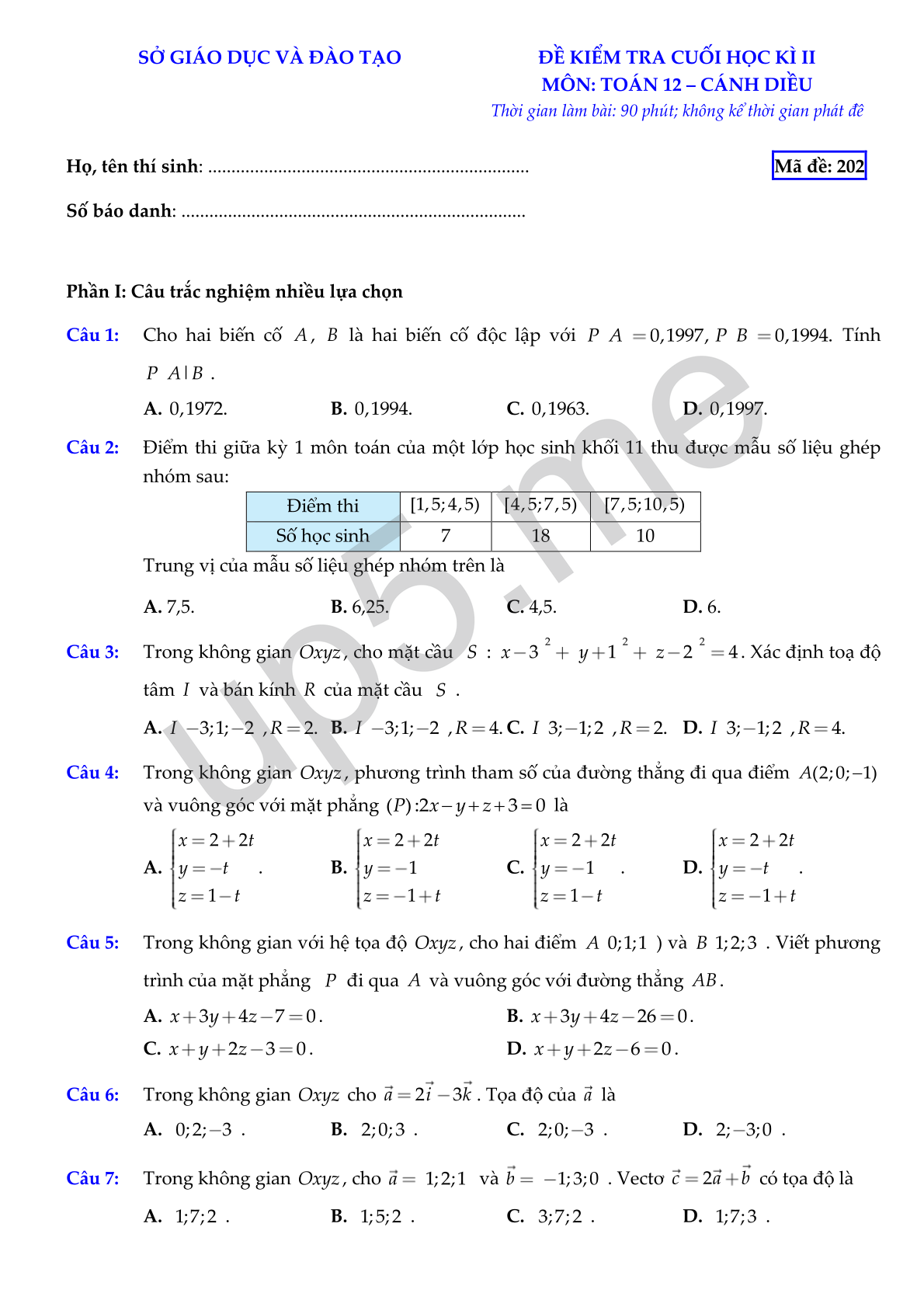Họ, tên thí sinh: ..................................................................... Mã đề: 202
