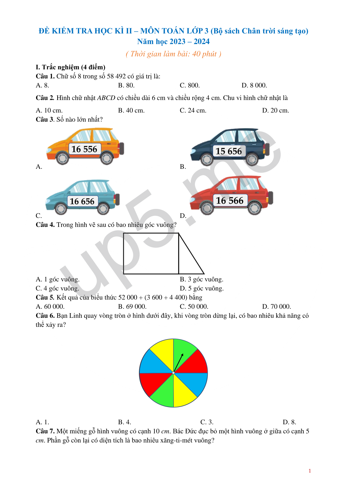 Câu 1. Chữ số 8 trong số 58 492 có giá trị là: