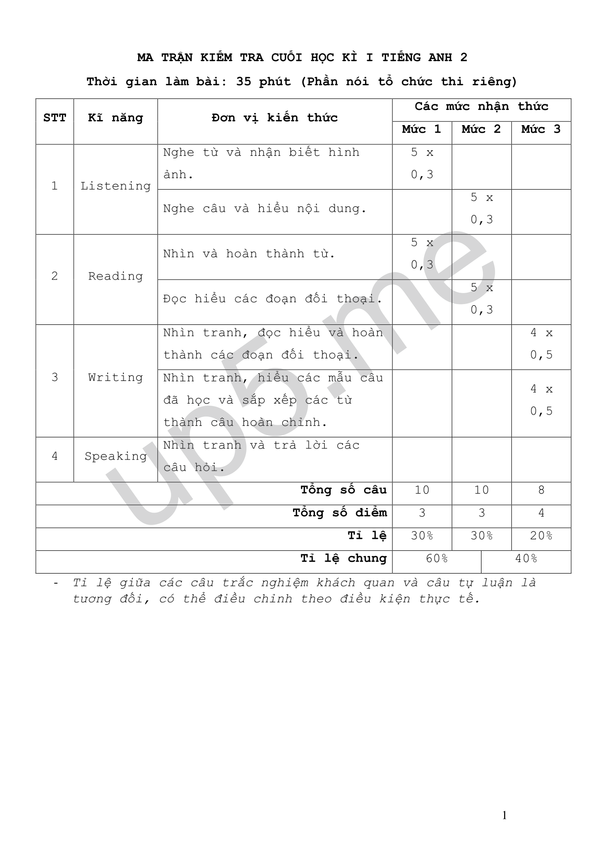 Đề kiểm tra cuối học kì II môn Tiếng Anh lớp 2
