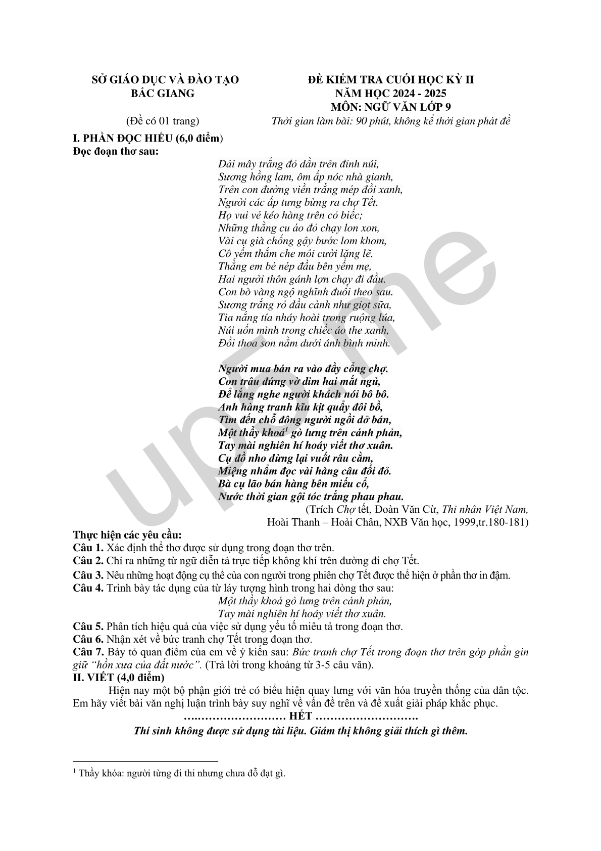 | SỞ GIÁO DỤC VÀ ĐÀO TẠOBẮC GIANG(Đề có 01 trang) | ĐỀ KIỂM TRA CUỐI HỌC KỲ IINĂM HỌC 2024 - 2025MÔN: NGỮ VĂN LỚP 9Thời gian làm bài: 90 phút, không kể thời gian phát đề |