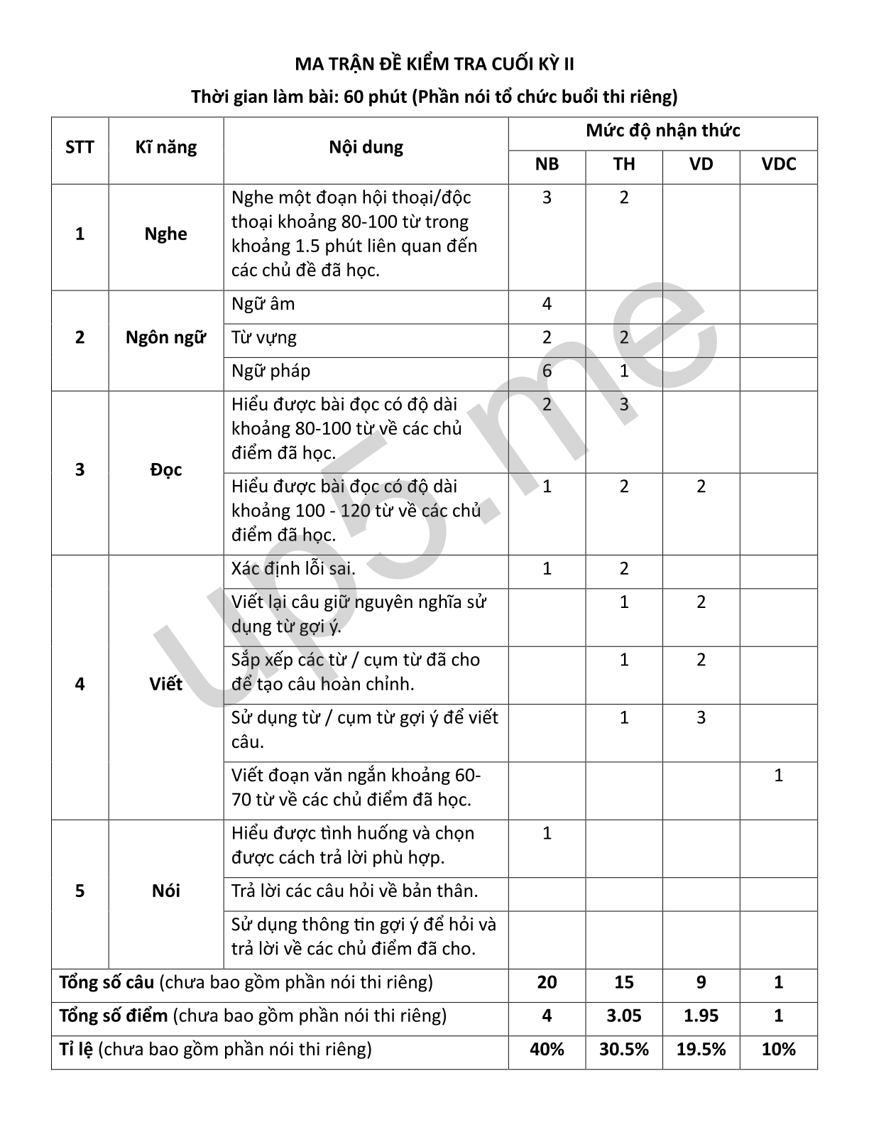 Thời gian làm bài: 60 phút (Phần nói tổ chức buổi thi riêng)