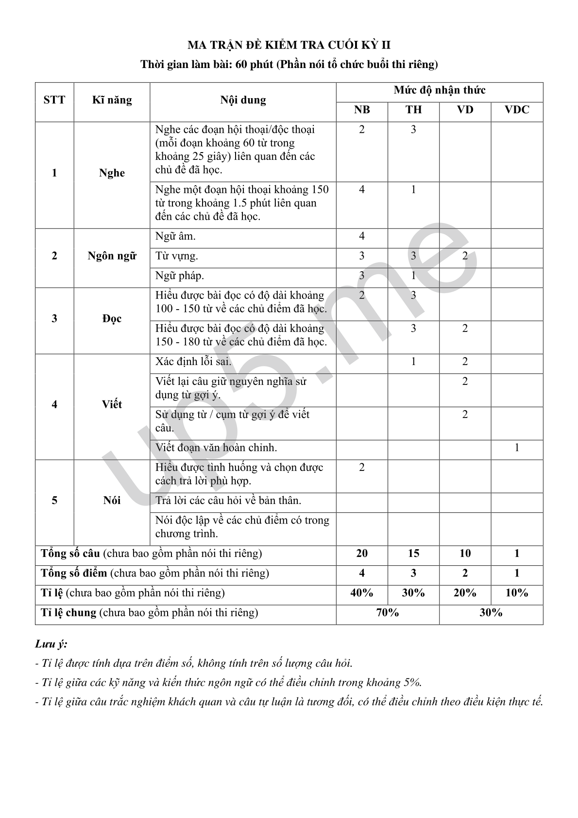 Thời gian làm bài: 60 phút (Phần nói tổ chức buổi thi riêng)