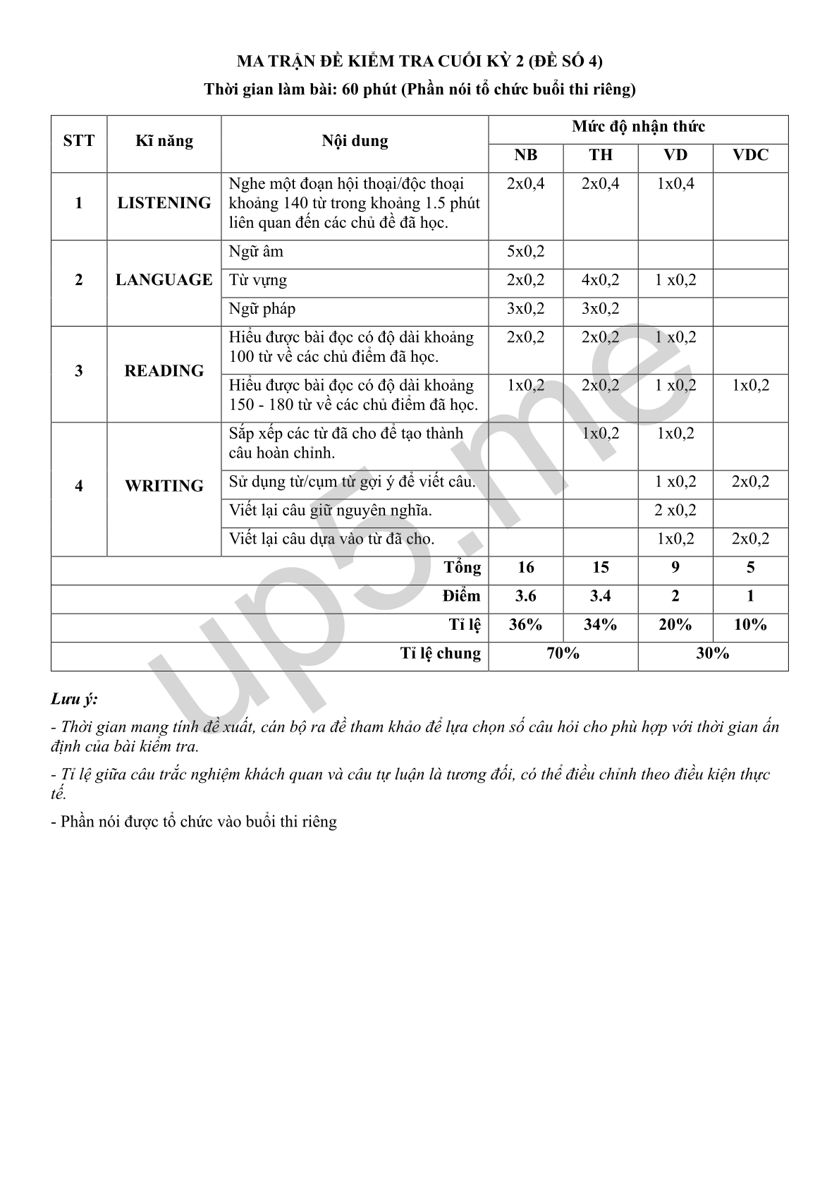 Thời gian làm bài: 60 phút (Phần nói tổ chức buổi thi riêng)