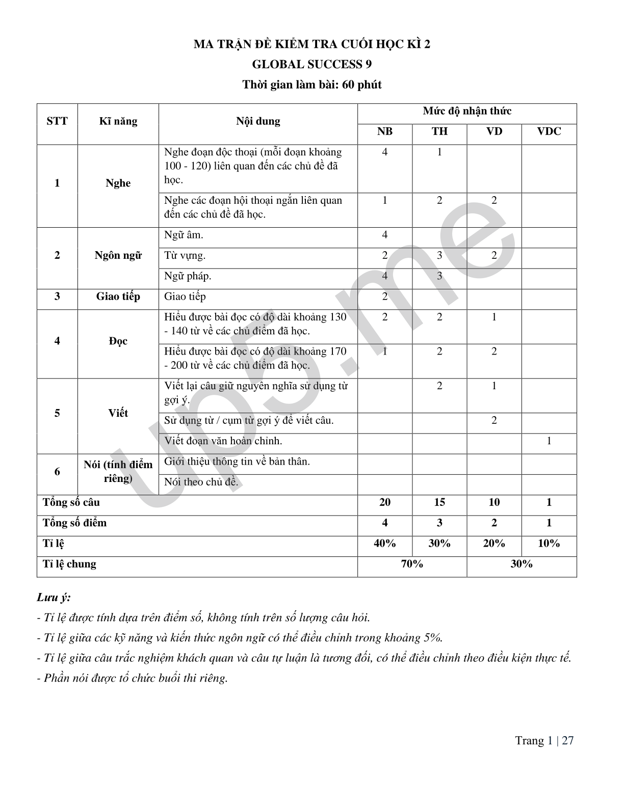 | 1 | Nghe | Nghe đoạn độc thoại (mỗi đoạn khoảng 100 - 120) liên quan đến các chủ đề đã học. | 4 | 1 | ||