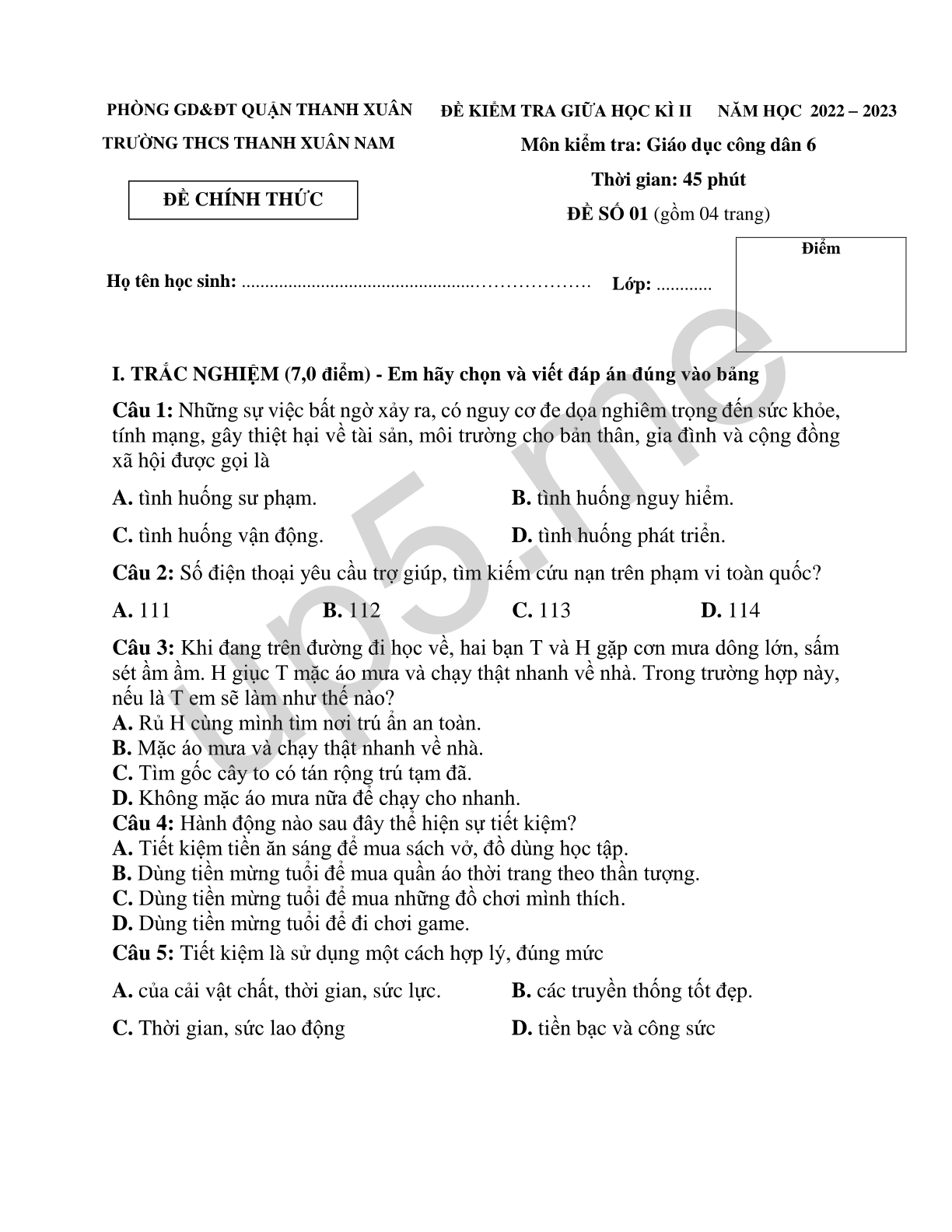 | TRƯỜNG THCS THANH XUÂN NAM | Môn kiểm tra: Giáo dục công dân 6 | ||
