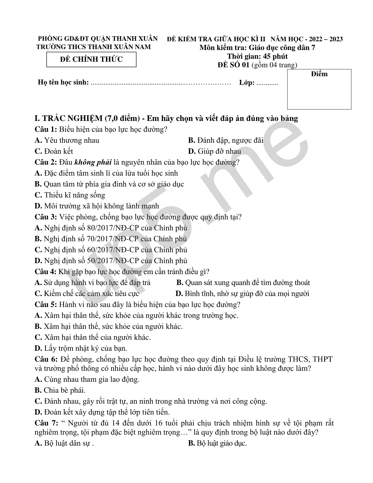 | TRƯỜNG THCS THANH XUÂN NAM | Môn kiểm tra: Giáo dục công dân 7 | ||