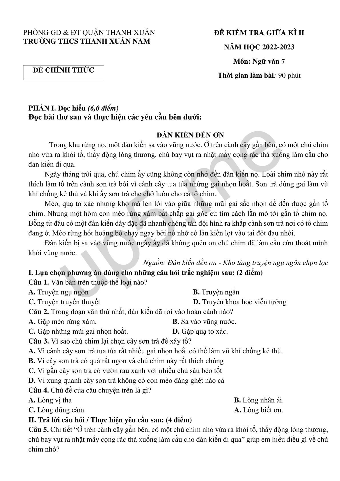 ĐỀ KIỂM TRA GIỮA KÌ II NĂM HỌC 2022-2023 Môn: Ngữ văn 7 Thời gian làm bài: 90 phút |