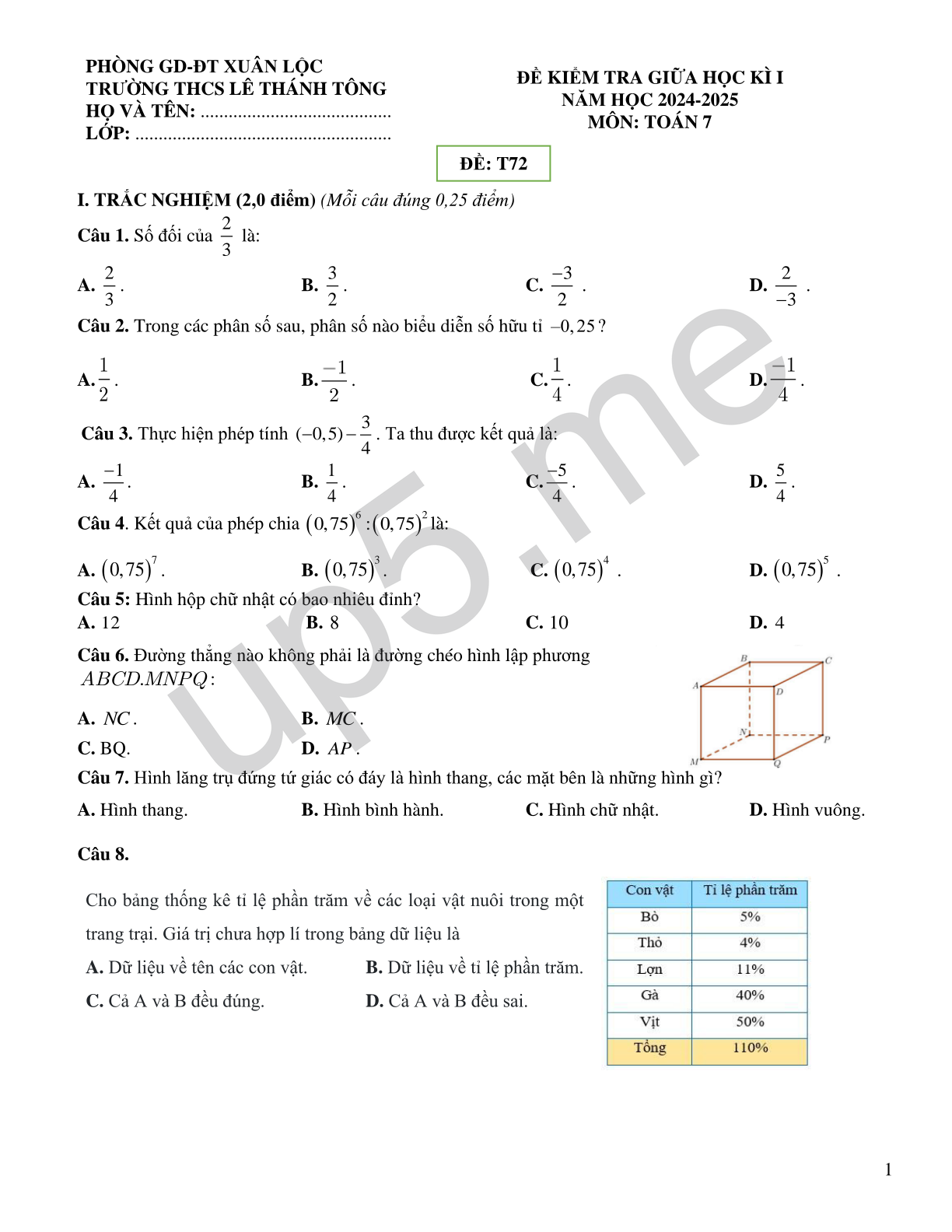 | PHÒNG GD-ĐT XUÂN LỘCTRƯỜNG THCS LÊ THÁNH TÔNGHỌ VÀ TÊN: .........................................LỚP: ....................................................... | ĐỀ KIỂM TRA GIỮA HỌC KÌ INĂM HỌC 2024-2025MÔN: TOÁN 7 |