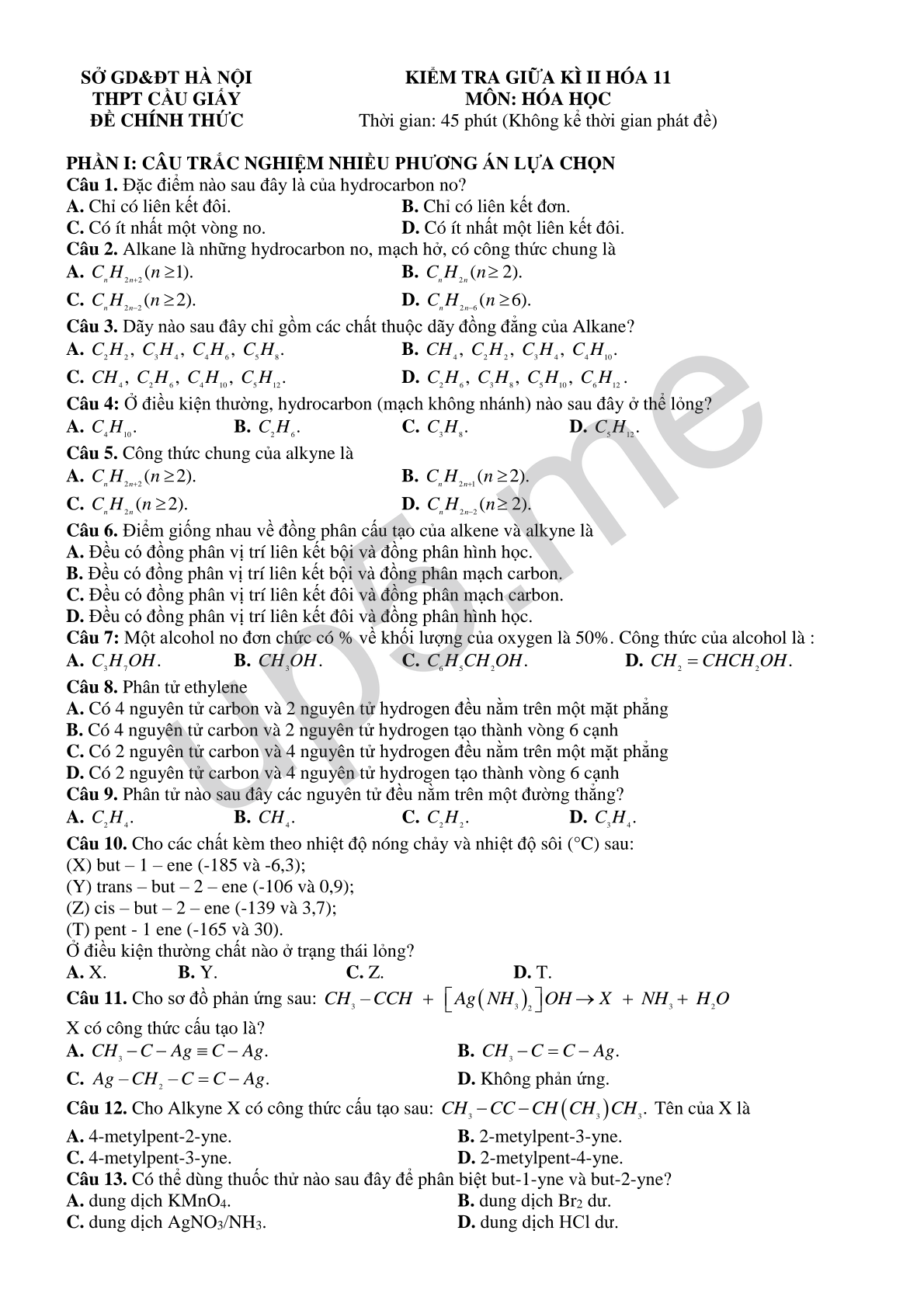 | SỞ GD&ĐT HÀ NỘITHPT CẦU GIẤYĐỀ CHÍNH THỨC | KIỂM TRA GIỮA KÌ II HÓA 11MÔN: HÓA HỌCThời gian: 45 phút (Không kể thời gian phát đề) |