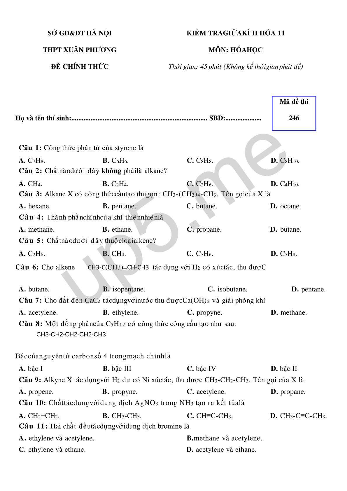 Câu 2: Chất nào dưới đây không phải là alkane?