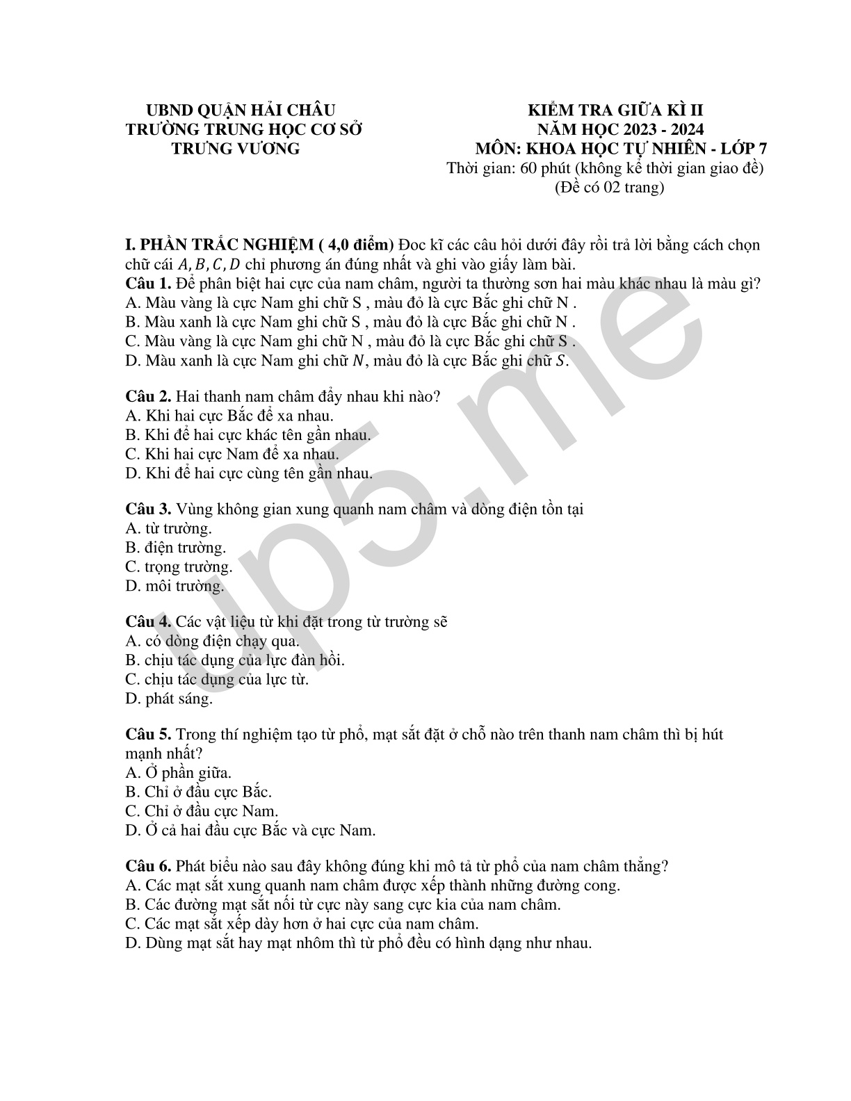 Câu 1. Để phân biệt hai cực của nam châm, người ta thường sơn hai màu khác nhau là màu gì?