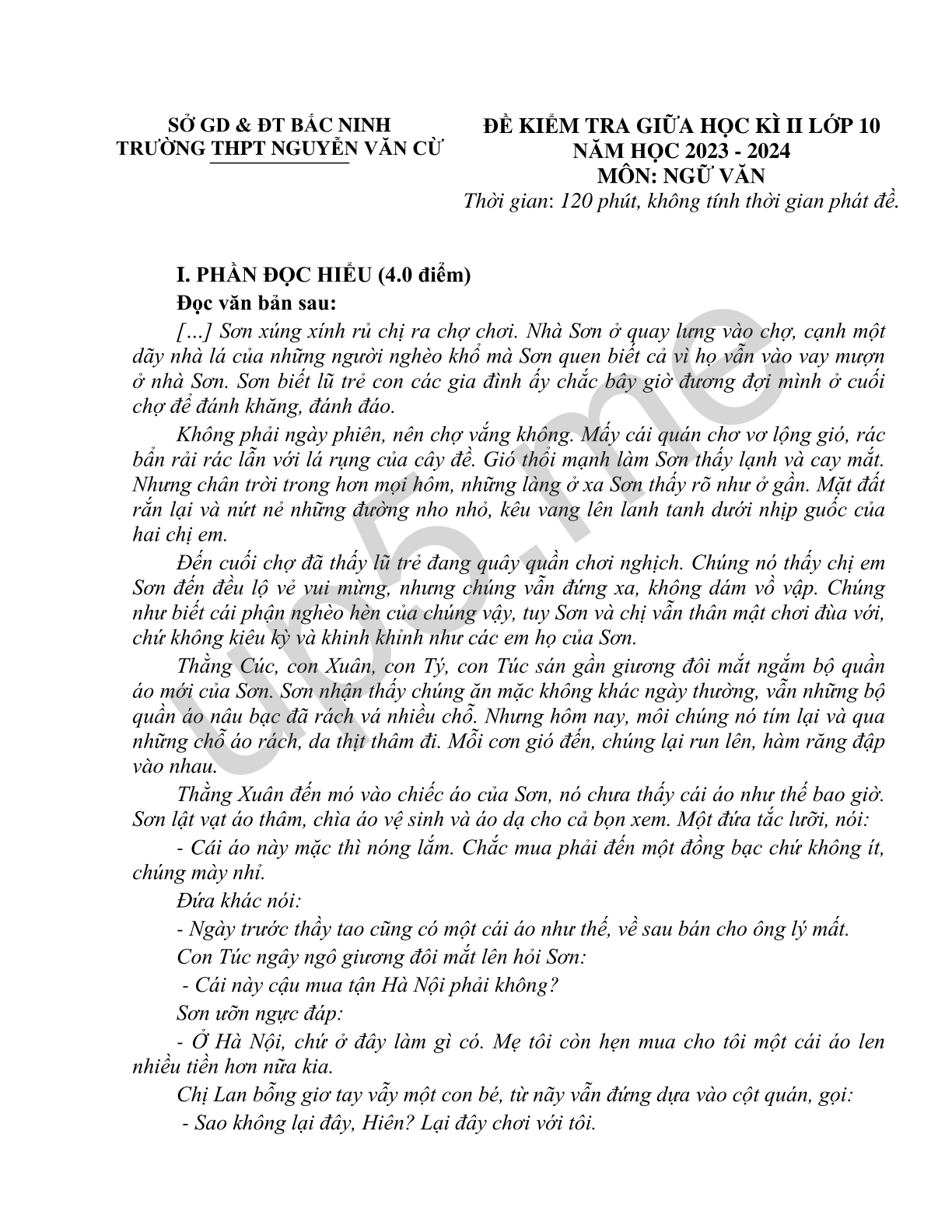 ĐỀ KIỂM TRA GIỮA HỌC KÌ II LỚP 10 NĂM HỌC 2023 - 2024 MÔN: NGỮ VĂN Thời gian: 120 phút, không tính thời gian phát đề. |