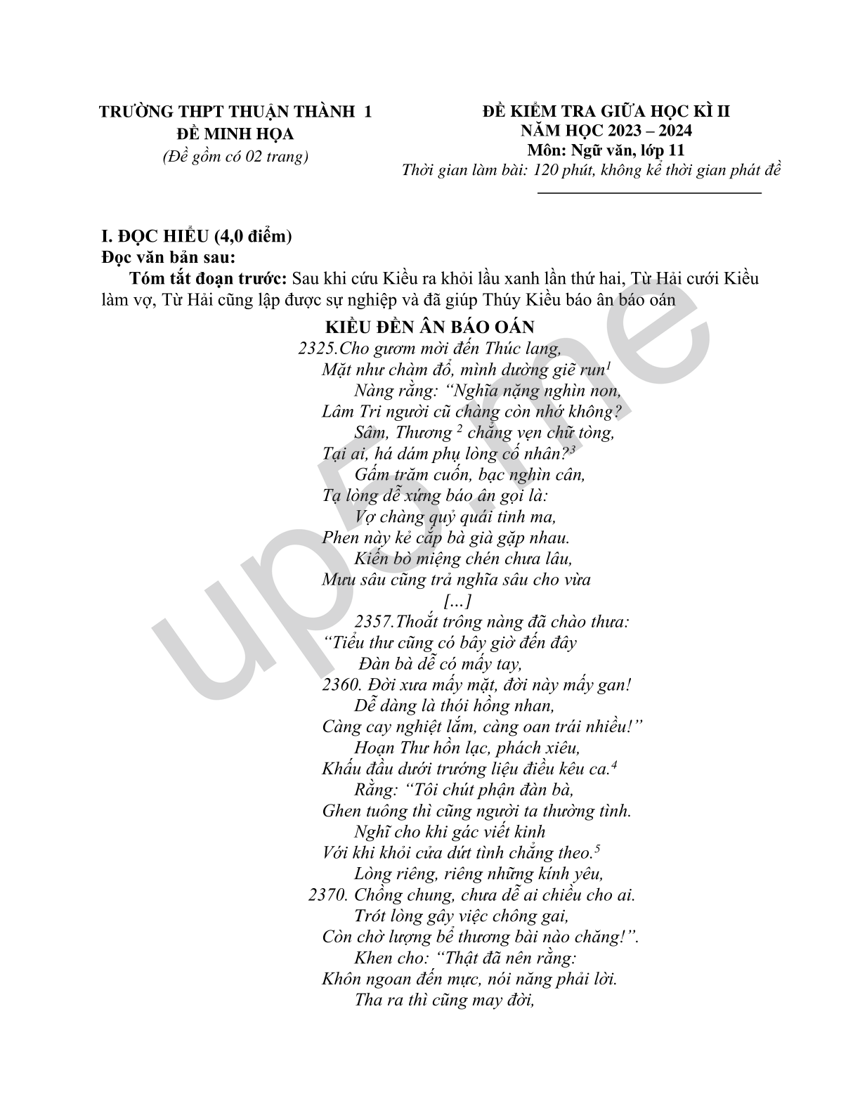 ĐỀ KIỂM TRA GIỮA HỌC KÌ IINĂM HỌC 2023 – 2024 Môn: Ngữ văn, lớp 11 Thời gian làm bài: 120 phút, không kể thời gian phát đề |