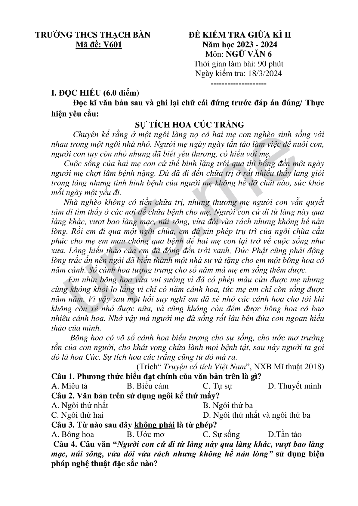 ĐỀ KIỂM TRA GIỮA KÌ II Năm học 2023 - 2024 Môn: NGỮ VĂN 6 Thời gian làm bài: 90 phútNgày kiểm tra: 18/3/2024-------------------- |