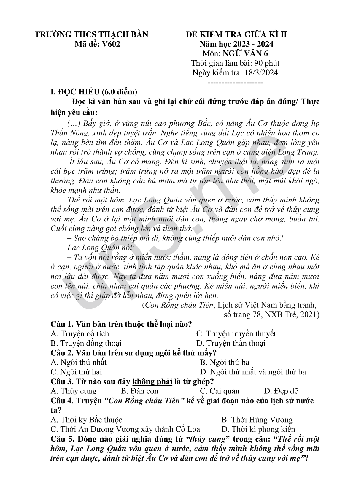 ĐỀ KIỂM TRA GIỮA KÌ II Năm học 2023 - 2024 Môn: NGỮ VĂN 6 Thời gian làm bài: 90 phútNgày kiểm tra: 18/3/2024-------------------- |
