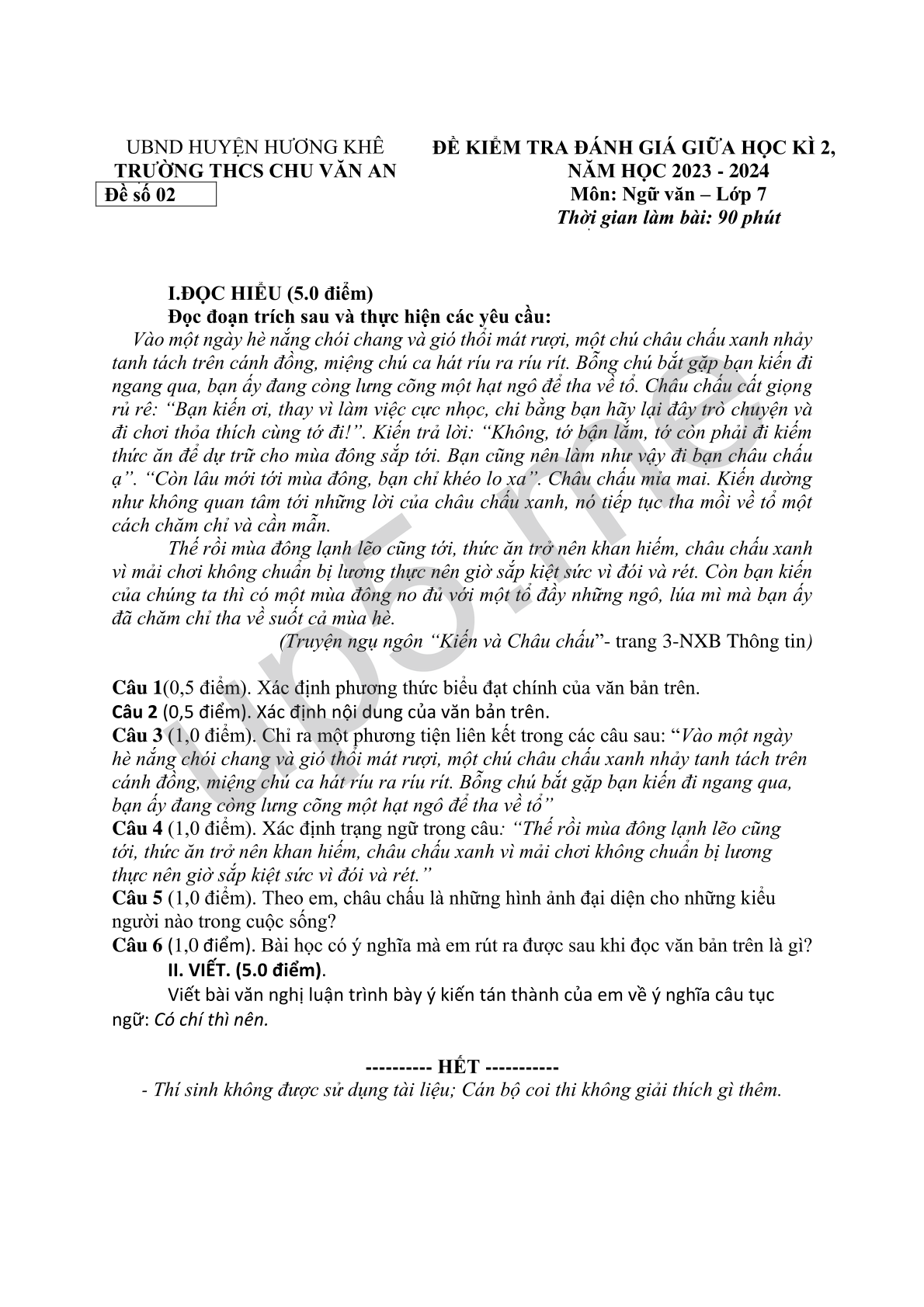ĐỀ KIỂM TRA ĐÁNH GIÁ GIỮA HỌC KÌ 2, NĂM HỌC 2023 - 2024 Môn: Ngữ văn – Lớp 7 Thời gian làm bài: 90 phút |
