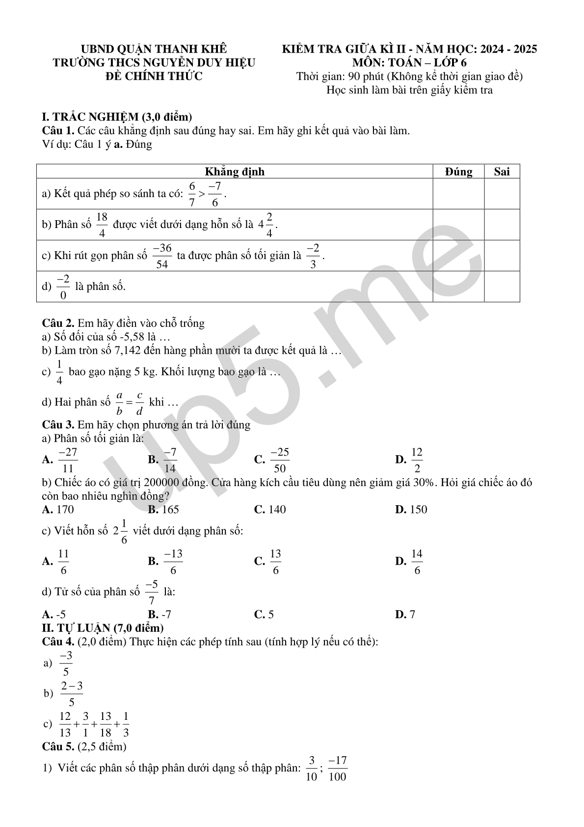 KIỂM TRA GIỮA KÌ II - NĂM HỌC: 2024 - 2025 MÔN: TOÁN – LỚP 6 Thời gian: 90 phút (Không kể thời gian giao đề) Học sinh làm bài trên giấy kiểm tra |