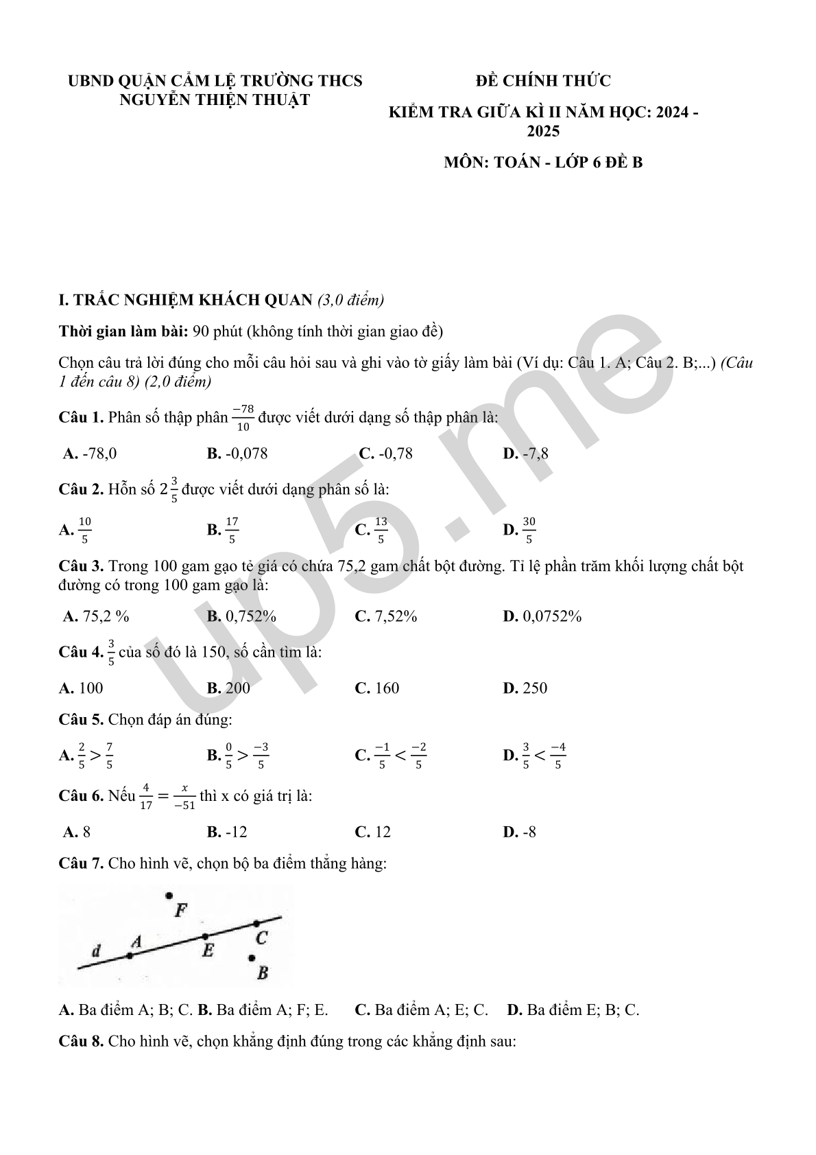 ĐỀ CHÍNH THỨCKIỂM TRA GIỮA KÌ II NĂM HỌC: 2024 - 2025MÔN: TOÁN - LỚP 6 ĐỀ B |