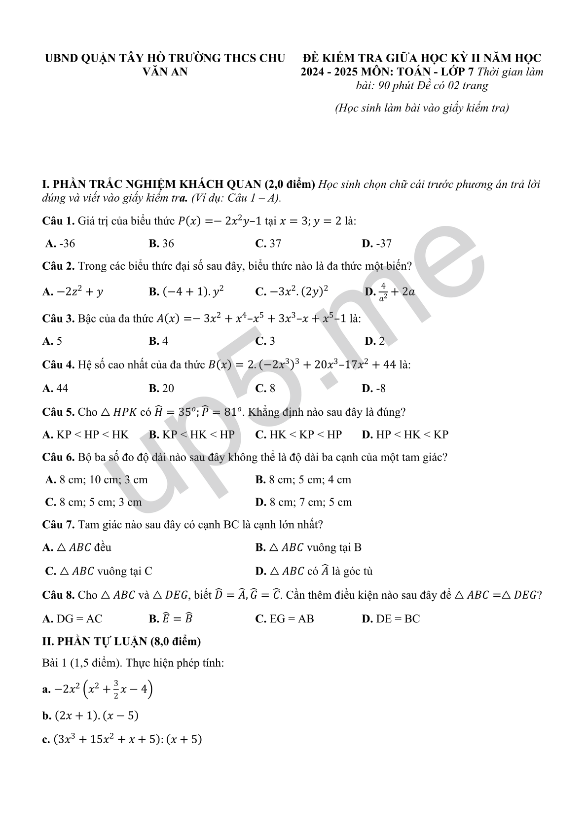 ĐỀ KIỂM TRA GIỮA HỌC KỲ II NĂM HỌC 2024 - 2025 MÔN: TOÁN - LỚP 7 Thời gian làm bài: 90 phút Đề có 02 trang(Học sinh làm bài vào giấy kiểm tra) |