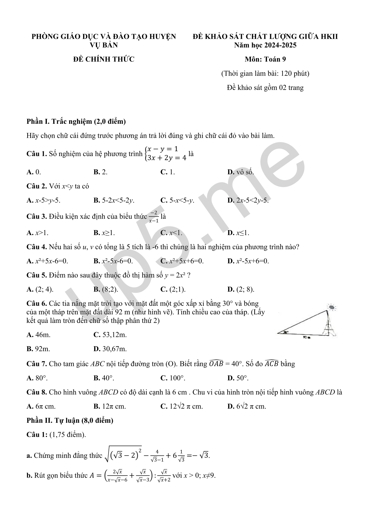 ĐỀ KHẢO SÁT CHẤT LƯỢNG GIỮA HKII Năm học 2024-2025 Môn: Toán 9 (Thời gian làm bài: 120 phút) Đề khảo sát gồm 02 trang |