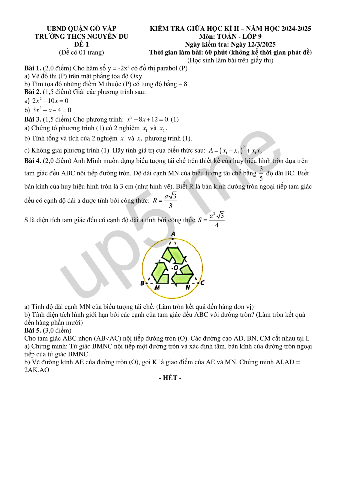 KIỂM TRA GIỮA HỌC KÌ II – NĂM HỌC 2024-2025 Môn: TOÁN - LỚP 9 Ngày kiểm tra: Ngày 12/3/2025 Thời gian làm bài: 60 phút (không kể thời gian phát đề) (Học sinh làm bài trên giấy thi) |