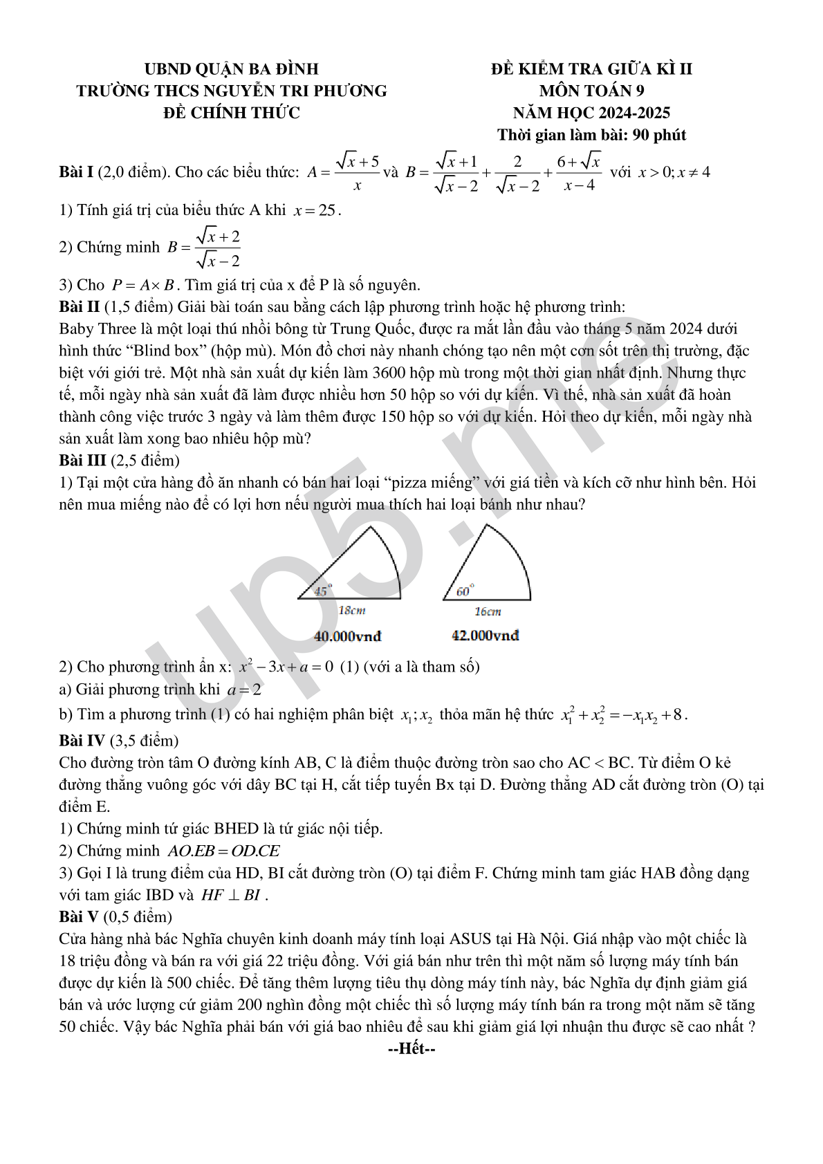 | UBND QUẬN BA ĐÌNHTRƯỜNG THCS NGUYỄN TRI PHƯƠNGĐỀ CHÍNH THỨC | ĐỀ KIỂM TRA GIỮA KÌ IIMÔN TOÁN 9NĂM HỌC 2024-2025Thời gian làm bài: 90 phút |