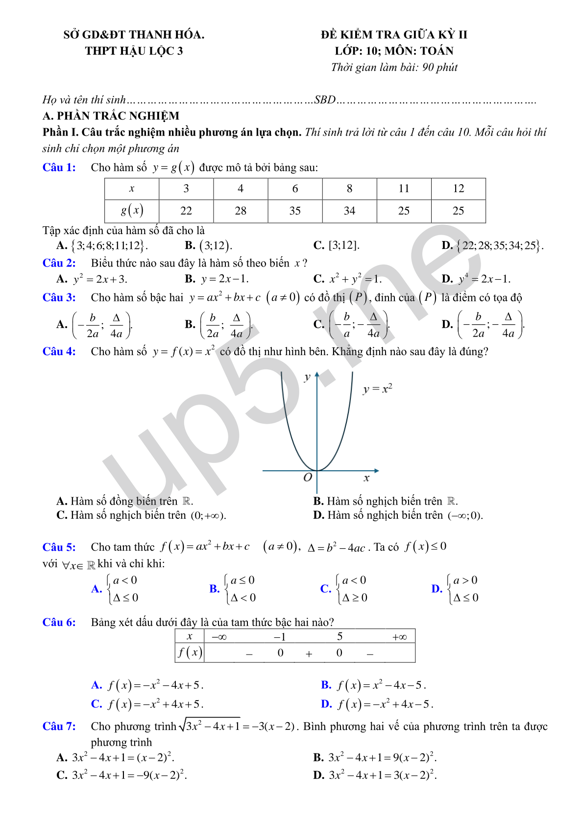 ĐỀ KIỂM TRA GIỮA KỲ II LỚP: 10; MÔN: TOÁN Thời gian làm bài: 90 phút |