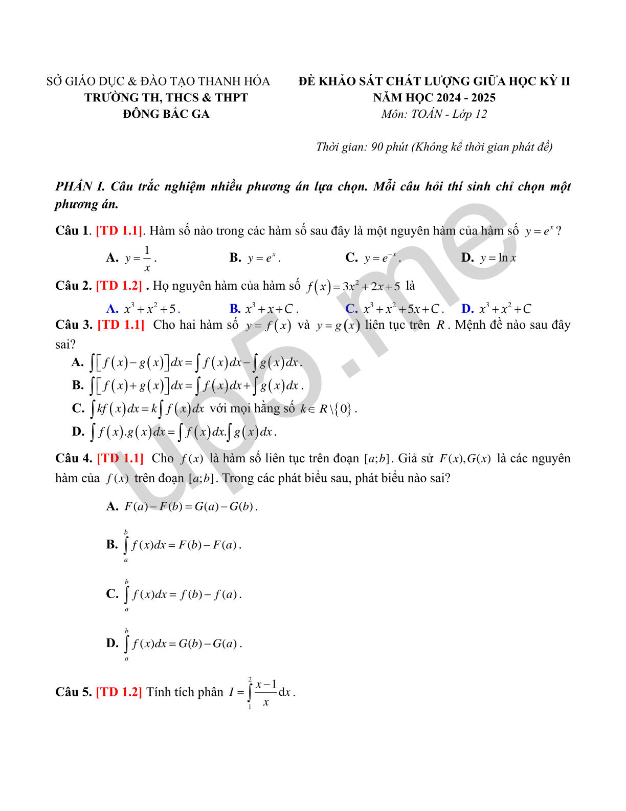 ĐỀ KHẢO SÁT CHẤT LƯỢNG GIỮA HỌC KỲ II NĂM HỌC 2024 - 2025 Môn: TOÁN - Lớp 12 |