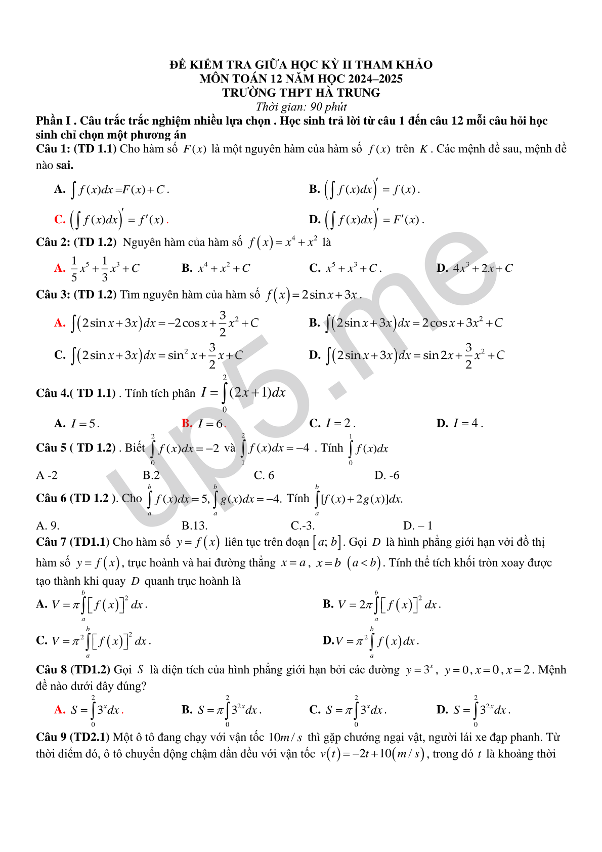 MÔN TOÁN 12 NĂM HỌC 2024–2025