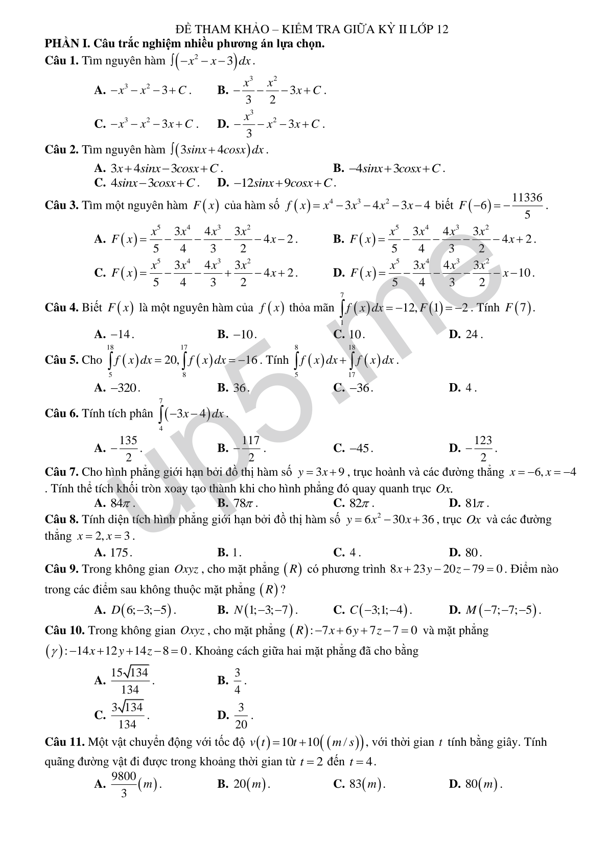 ĐỀ THAM KHẢO THPT THƯỜNG XUÂN 3 – KIỂM TRA GIỮA KỲ II LỚP 12