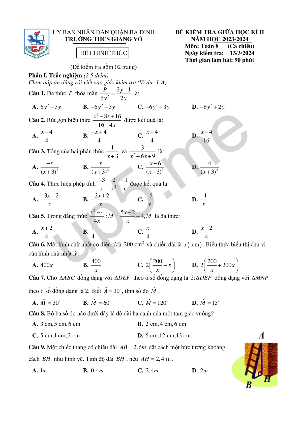 ĐỀ KIỂM TRA GIỮA HỌC KÌ II NĂM HỌC 2023-2024 Môn: Toán 8 (Ca chiều) Thời gian làm bài: 90 phút |