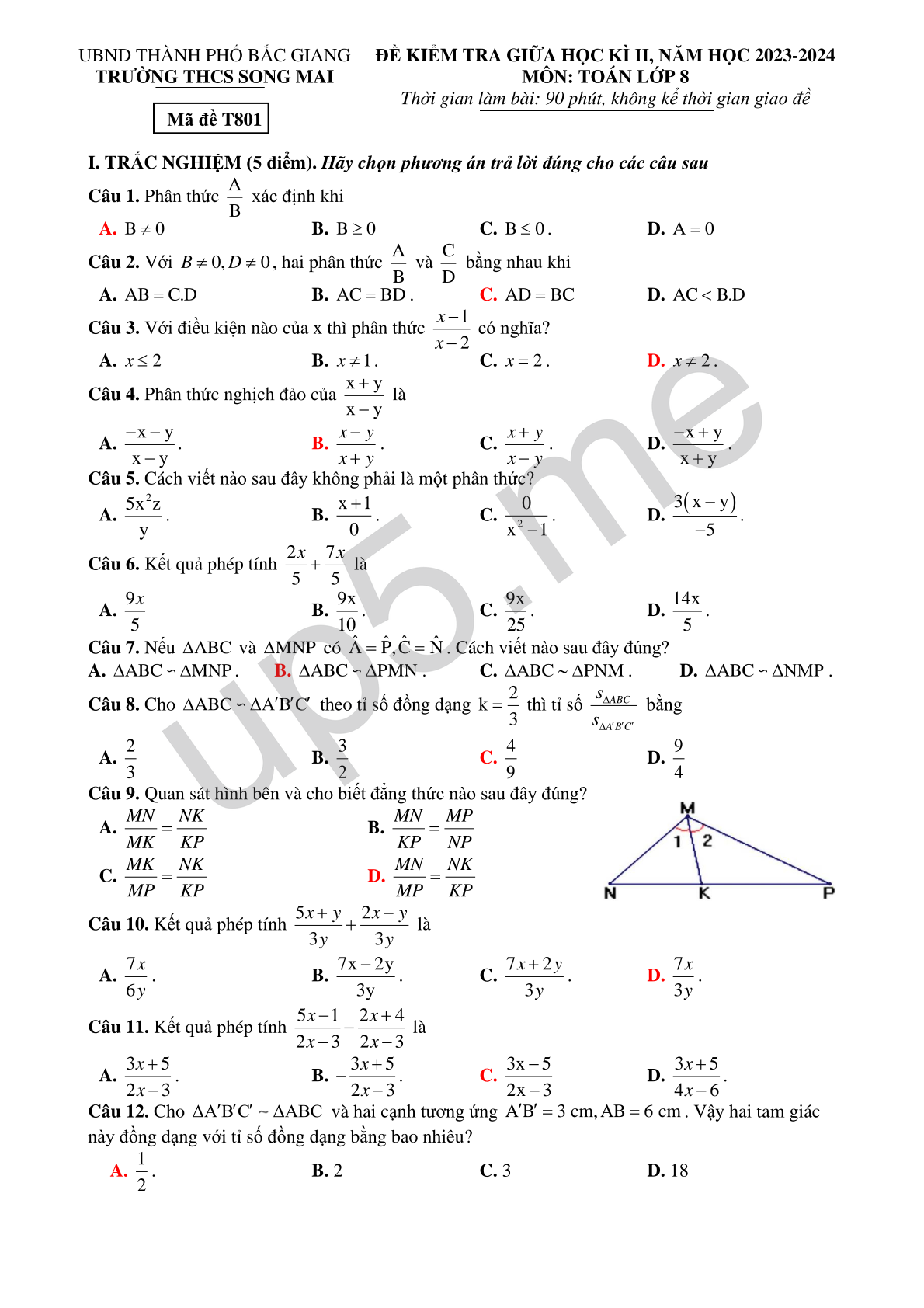ĐỀ KIỂM TRA GIỮA HỌC KÌ II, NĂM HỌC 2023-2024 MÔN: TOÁN LỚP 8 Thời gian làm bài: 90 phút, không kể thời gian giao đề |