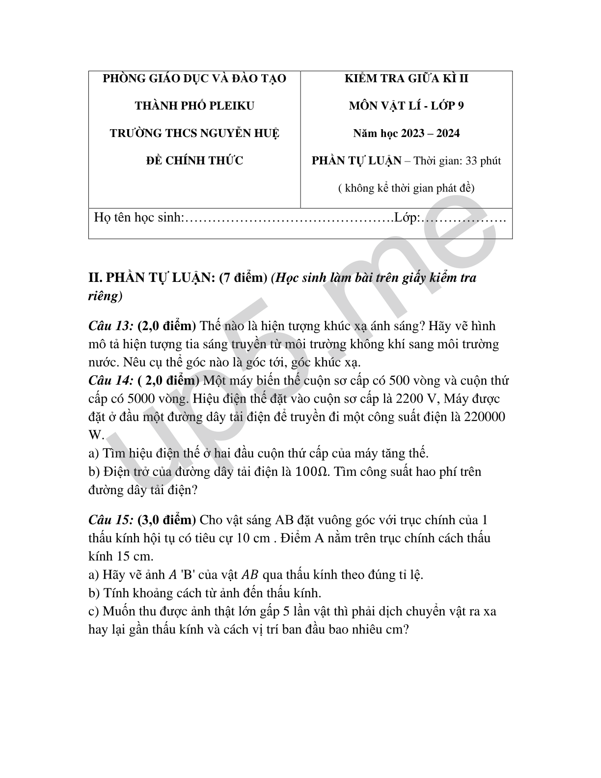 KIỂM TRA GIỮA KÌ II MÔN VẬT LÍ - LỚP 9 Năm học 2023 – 2024 PHẦN TỰ LUẬN – Thời gian: 33 phút( không kể thời gian phát đề) |