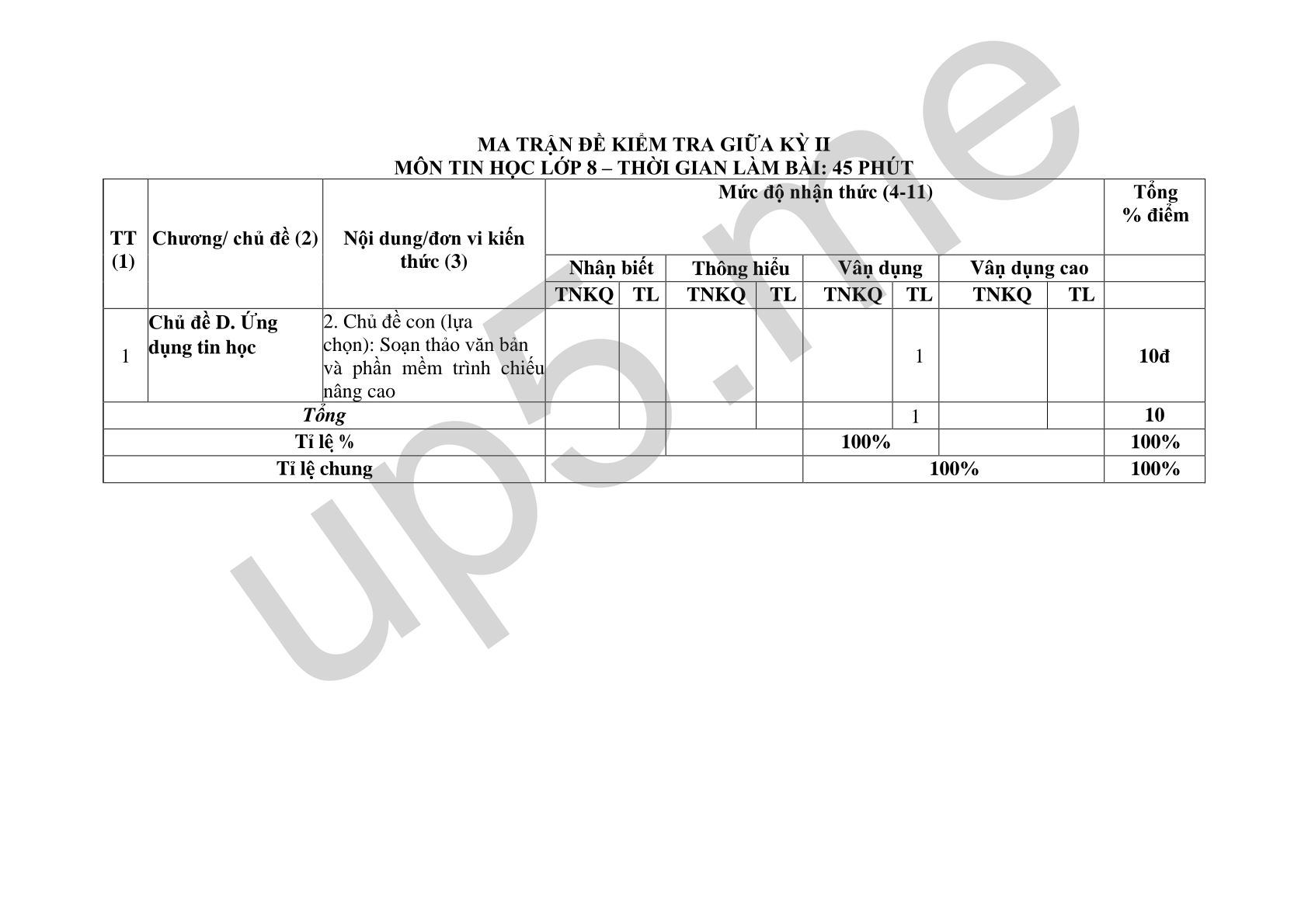 | 1 | Chủ đề D. Ứng dụng tin học | 2. Chủ đề con (lựachọn): Soạn thảo văn bảnvà phần mềm trình chiếu nâng cao | 1 | 10đ | |||||||