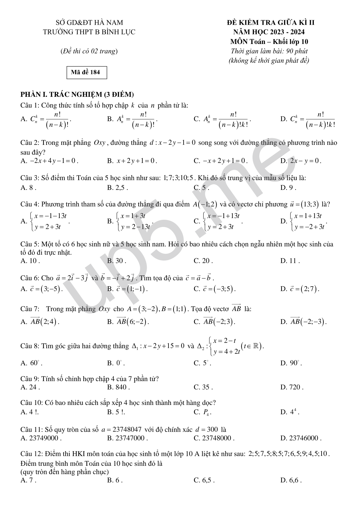 | Mã đề: 184 | (không kể thời gian phát đề) |