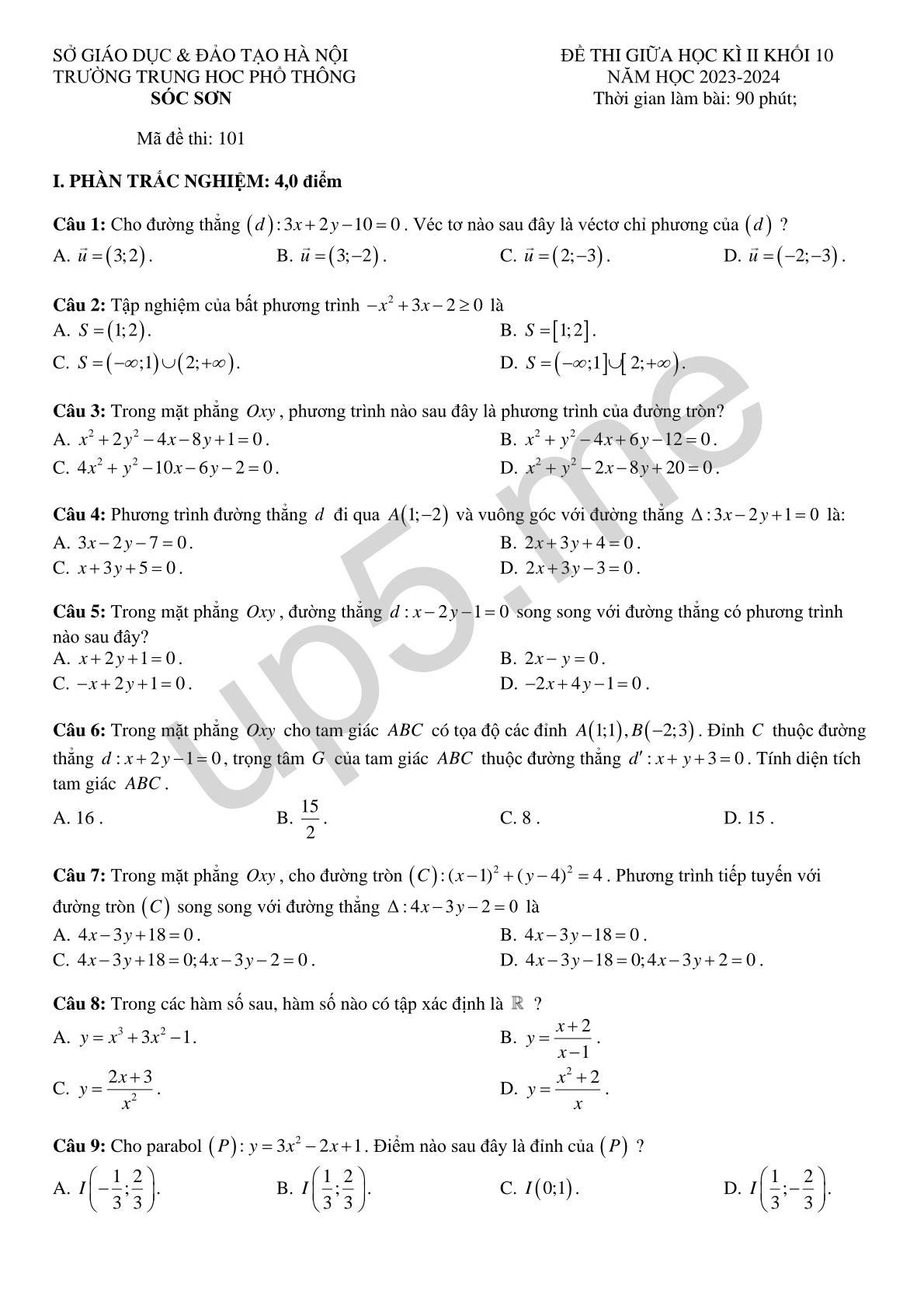 SỞ GIÁO DỤC & ĐẢO TẠO HÀ NỘI TRƯỜNG TRUNG HỌC PHỔ THÔNG SÓC SƠN Mã đề thi: 101 |