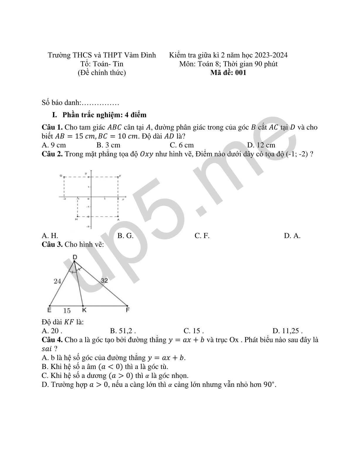 Kiểm tra giữa kì 2 năm học 2023-2024 Môn: Toán 8; Thời gian 90 phút Mã đề: 001 |