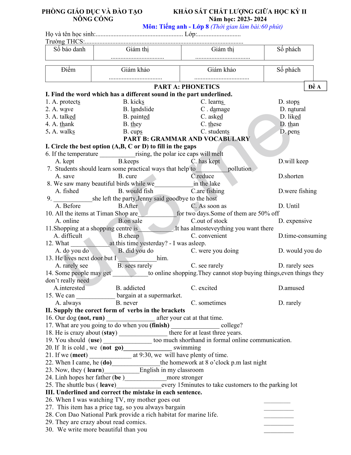 Môn: Tiếng anh - Lớp 8 (Thời gian làm bài:60 phút)