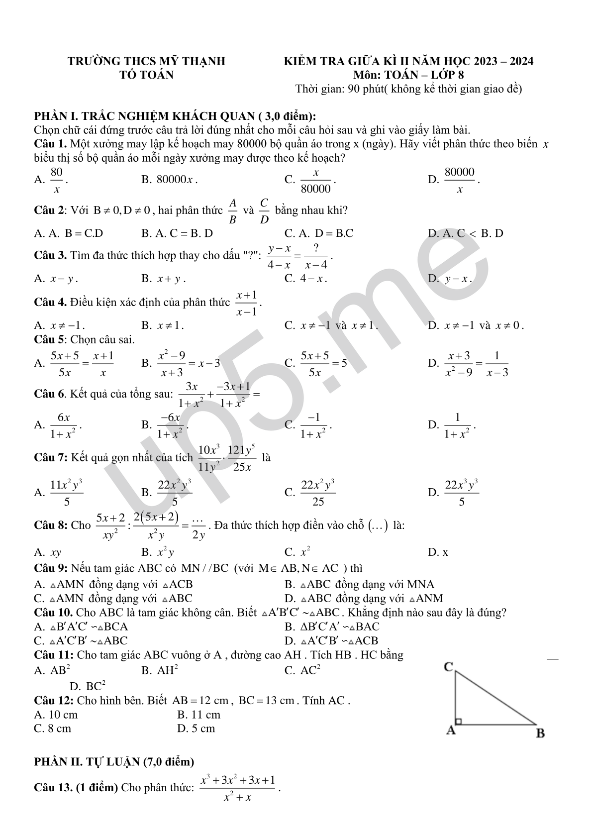 KIỂM TRA GIỮA KÌ II NĂM HỌC 2023 – 2024 Môn: TOÁN – LỚP 8 |
